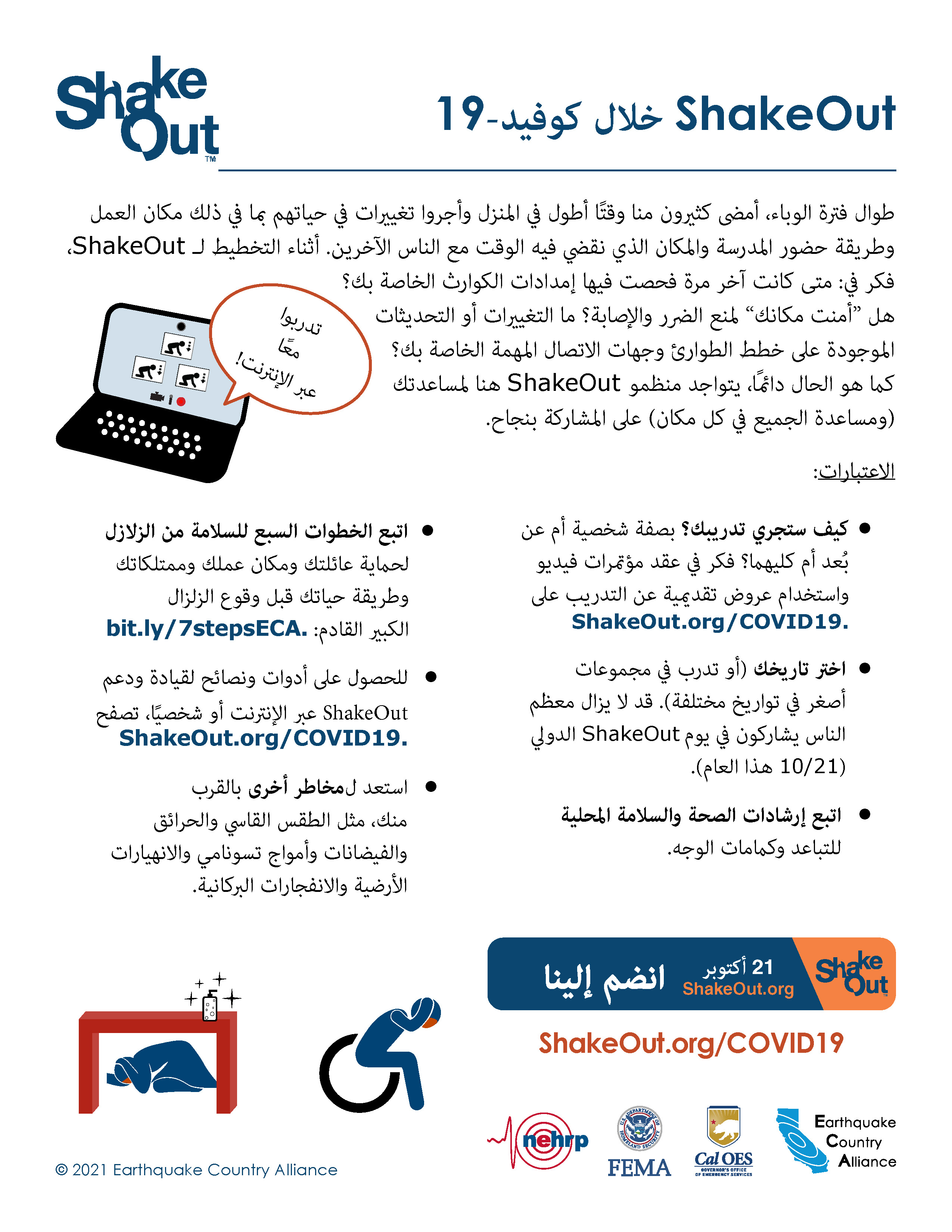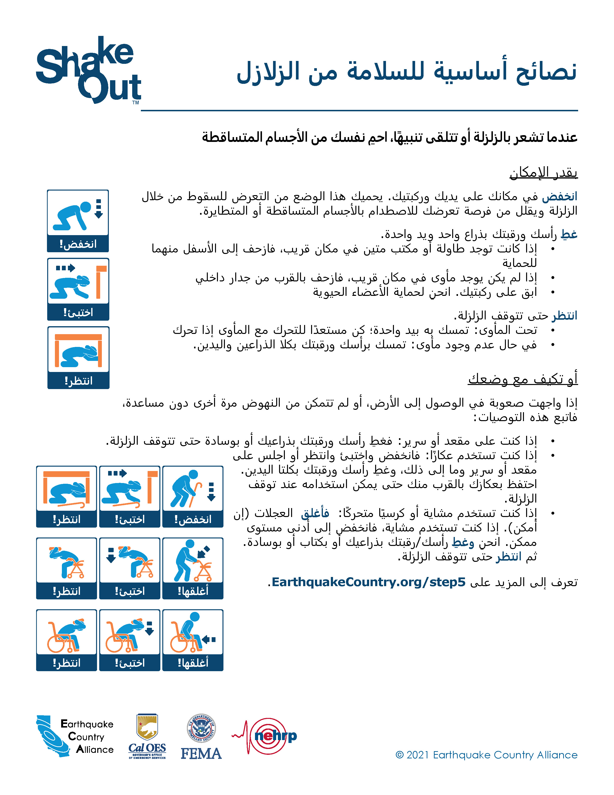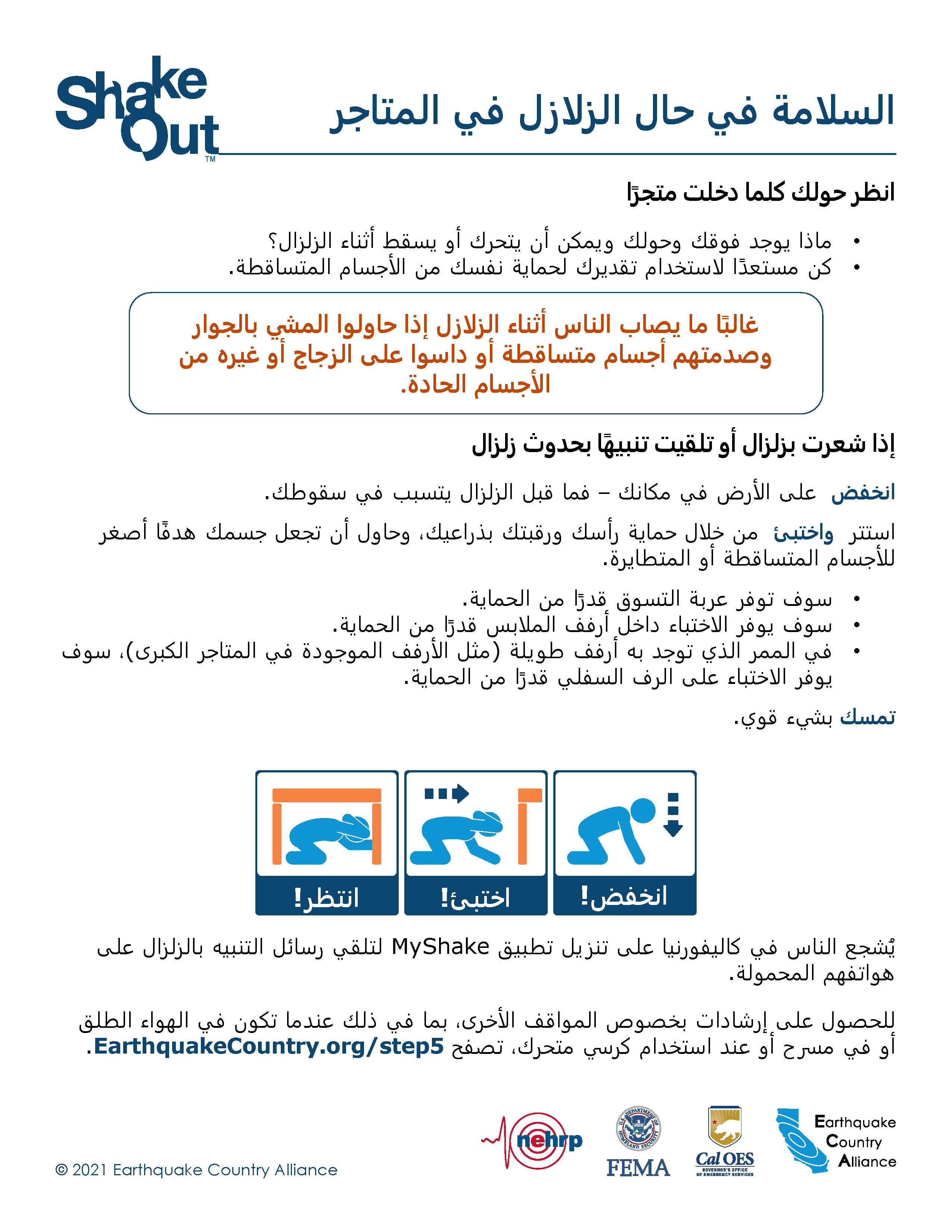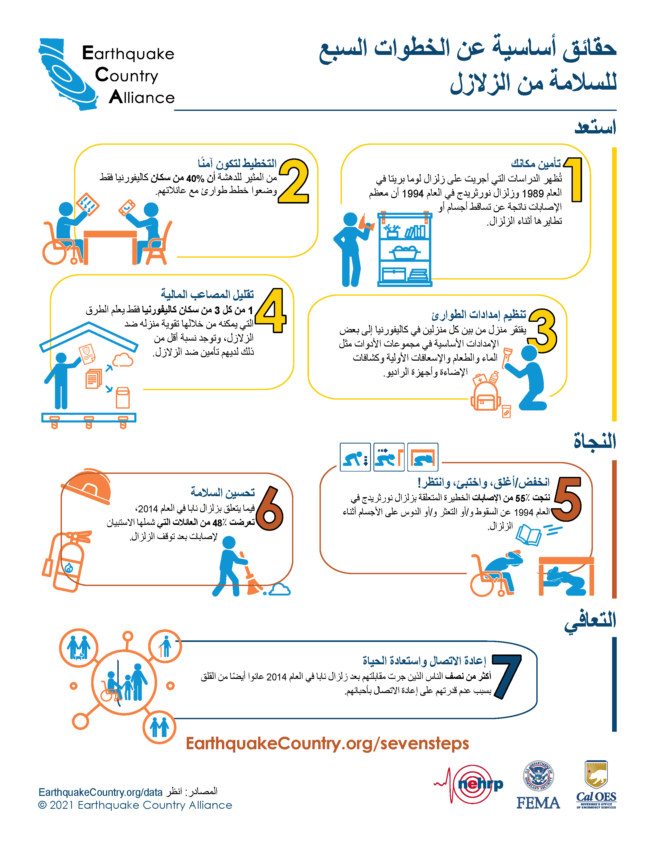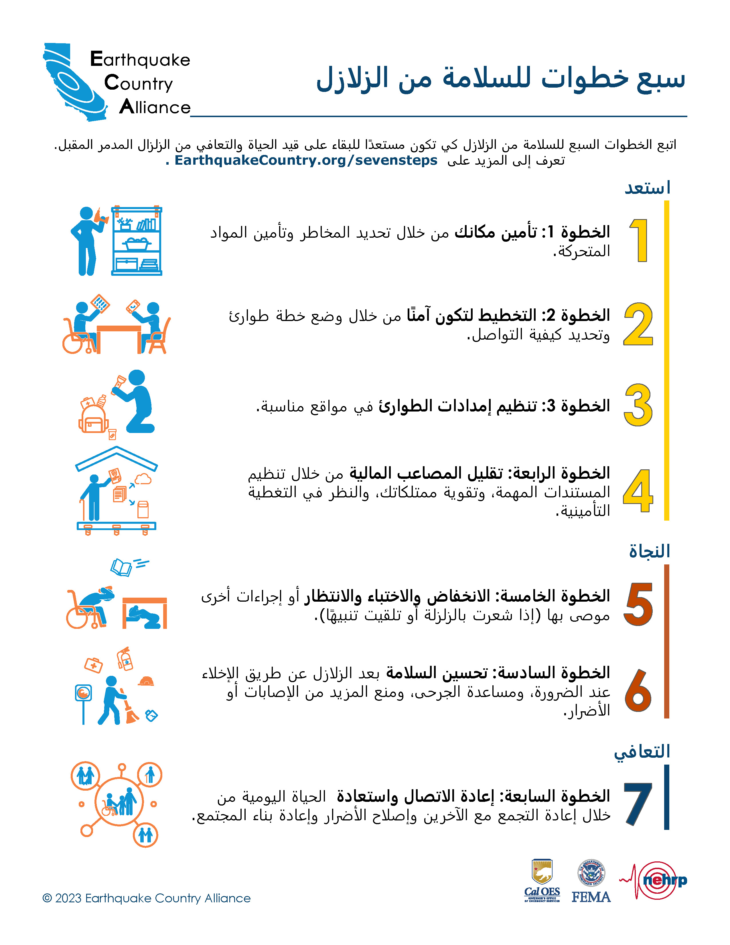 توجد موارد إعلامية عن السلامة من الزلازل لدى ECA باللغة عربي مدرجة أدناه ويمكن تنزيلها من الرابط EarthquakeCountry.org/arabic. تخضع كل وثيقة للتحسين للاستخدام مع أدوات الوصول مثل أدوات قراءة الشاشة.
