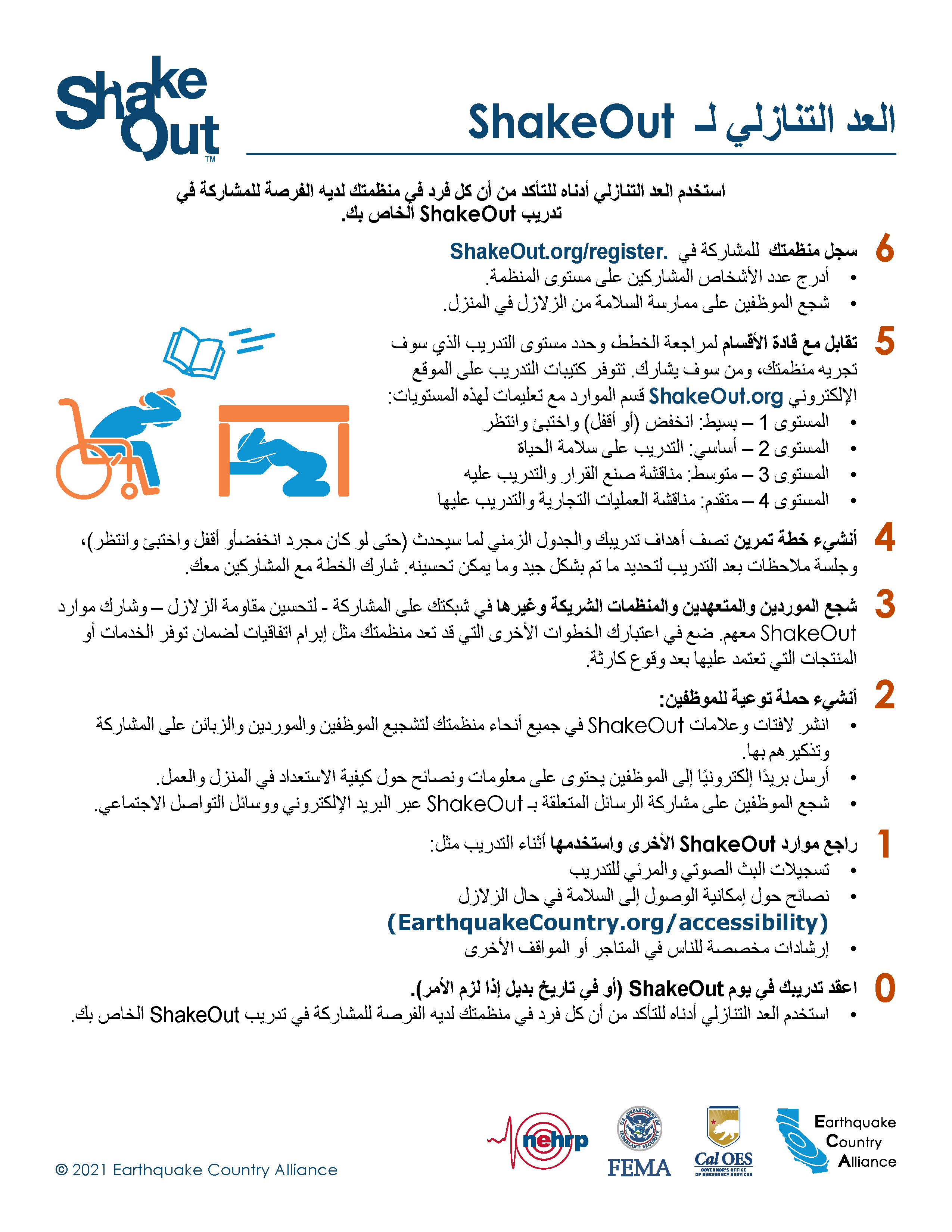 ECA has earthquake safety resources available in Arabic, listed below. Each document is configured with alt-text and correct read order (for people who use screen reader tools).