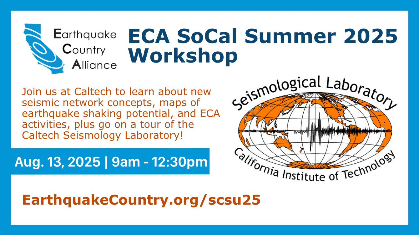 This in-person workshop at Caltech included presentations about the institution’s emergency planning, next generation seismic network concepts, new maps of earthquake shaking potential and local earthquake zones, updates about recent SoCal earthquakes, ECA activities and resources, 2025 ShakeOut planning, and more. The meeting also included time for participants to share about their activities, and was followed by a tour of the Caltech Seismological Laboratory!