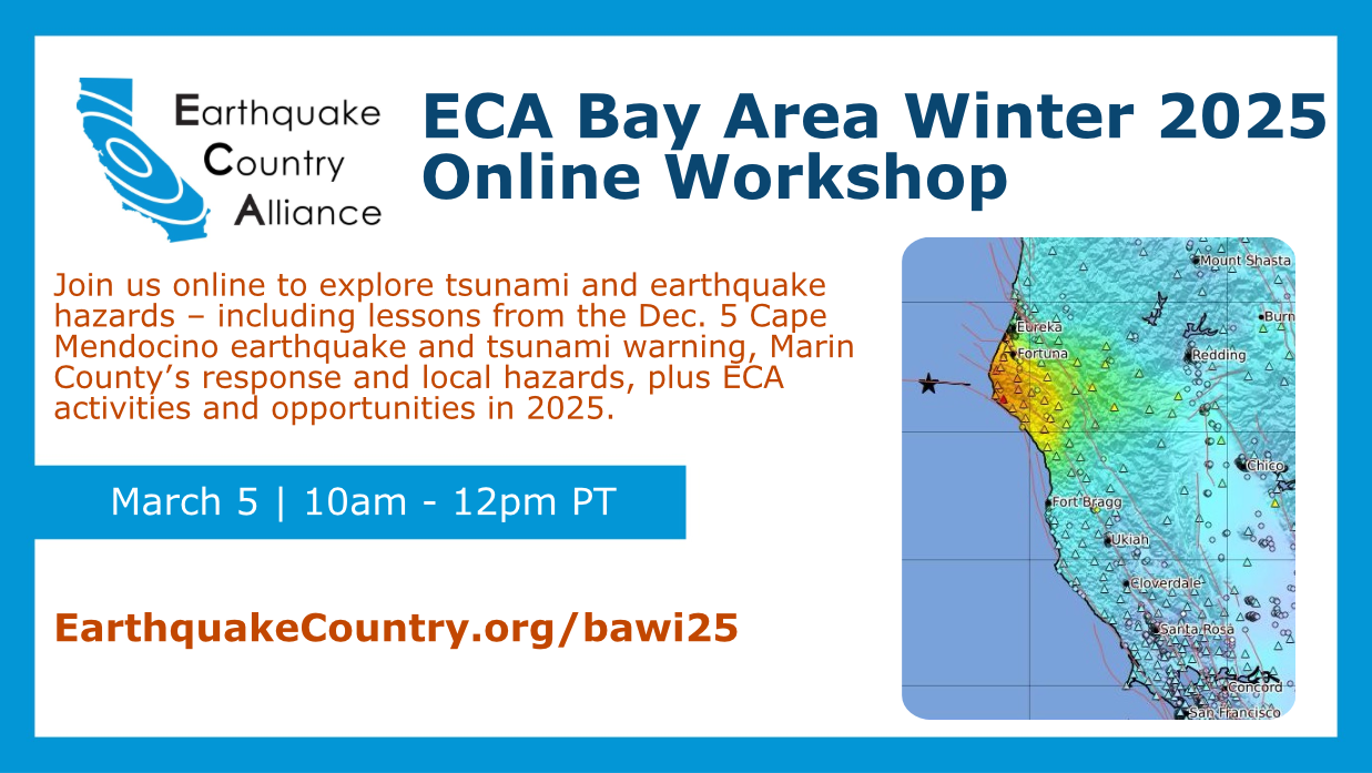Online (Zoom)OVERVIEW: presentations and discussion of Tsunami Science, Safety & Preparedness (including the recent volcanic tsunami); Recent Bay Area Earthquakes; and Hazard Mitigation Opportunities. Recording now available!