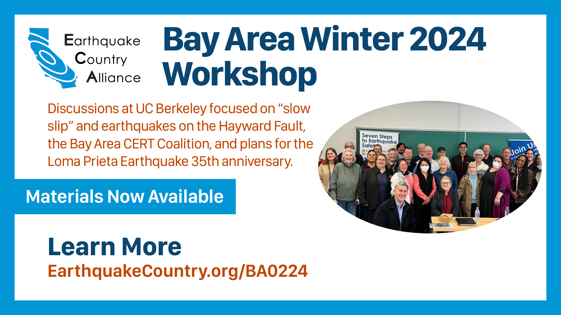 This workshop included presentations about potential new earthquake information tools and challenges with earthquake early warning, an overview of earthquake impacts on utilities and other lifelines and how to reduce them, and updates about how to request free ECA printed materials, mitigation materials, and more!