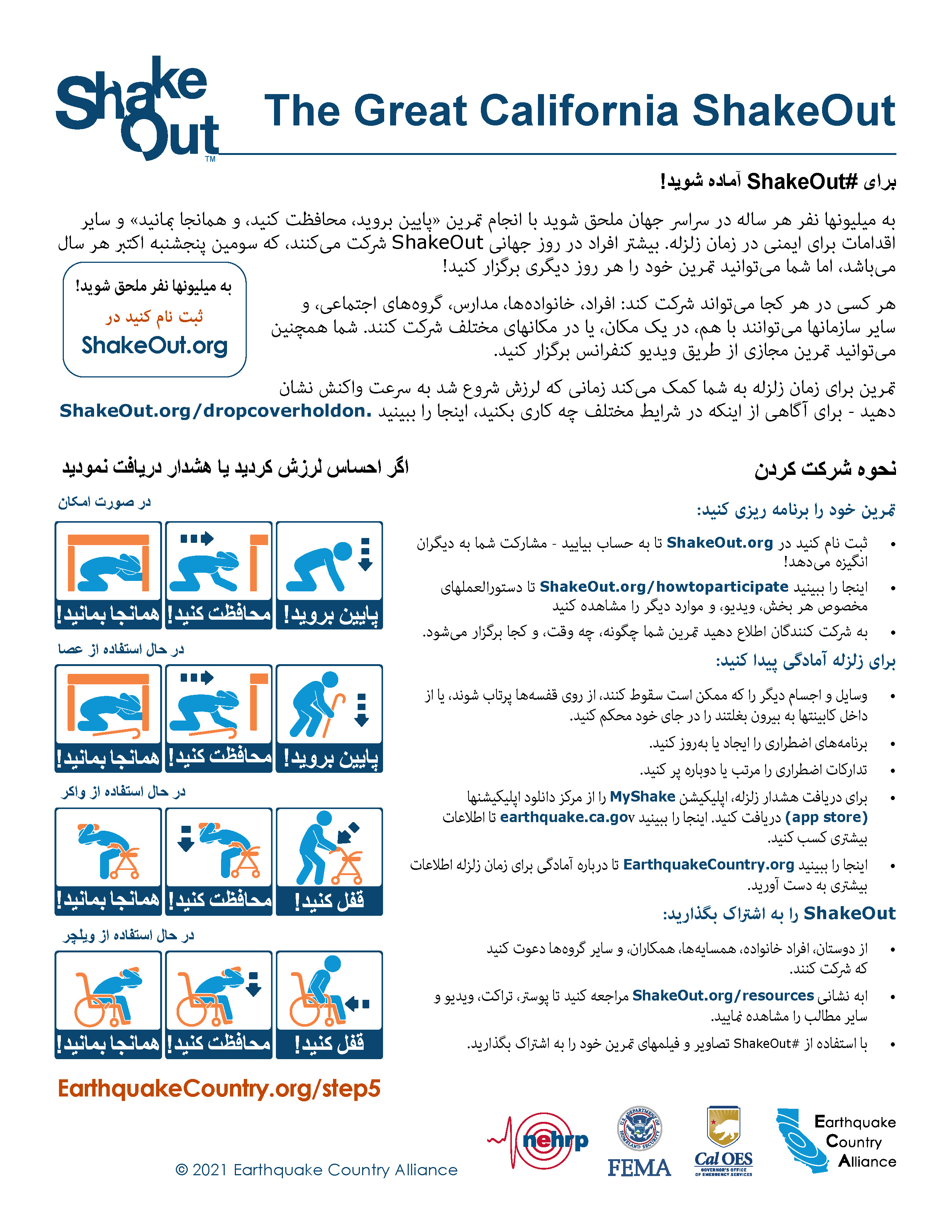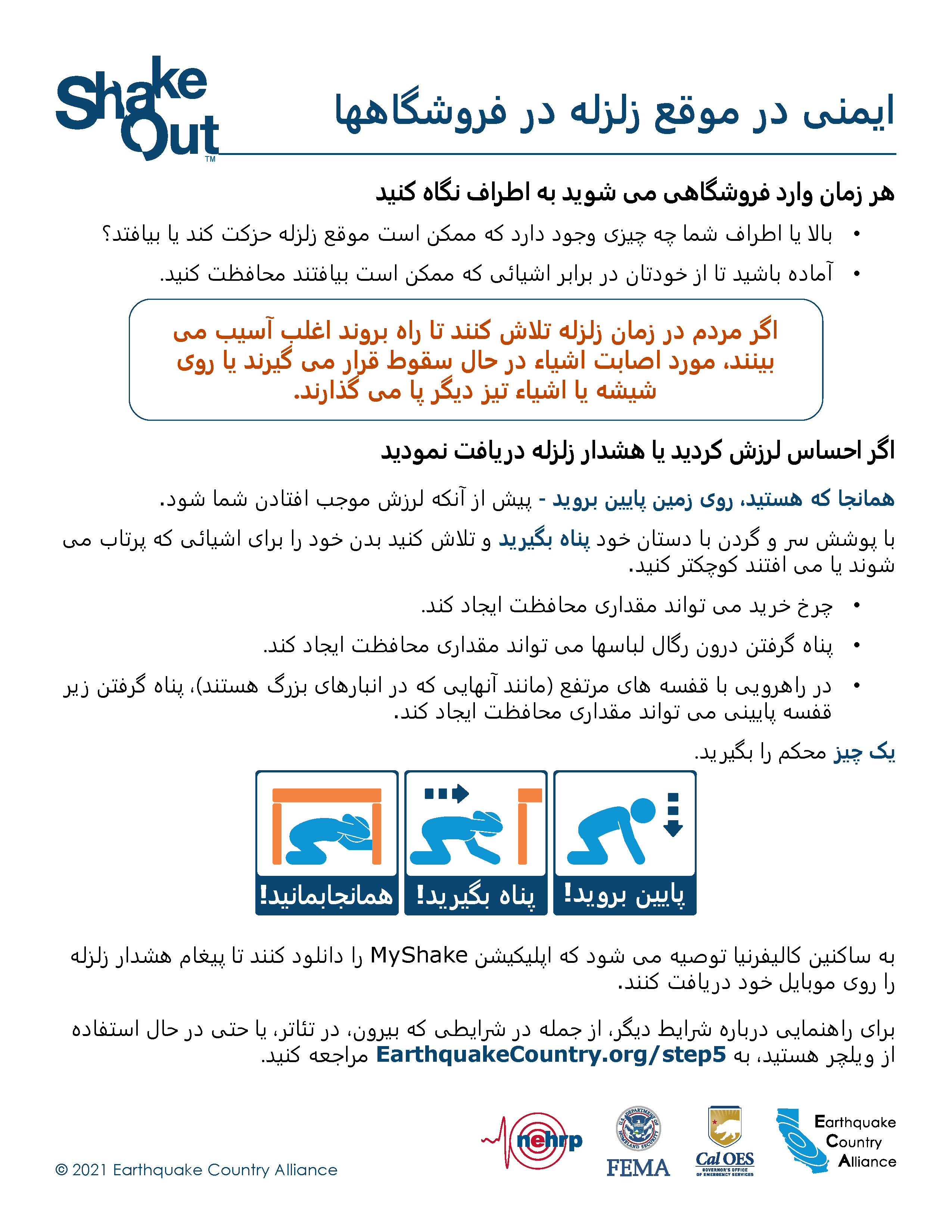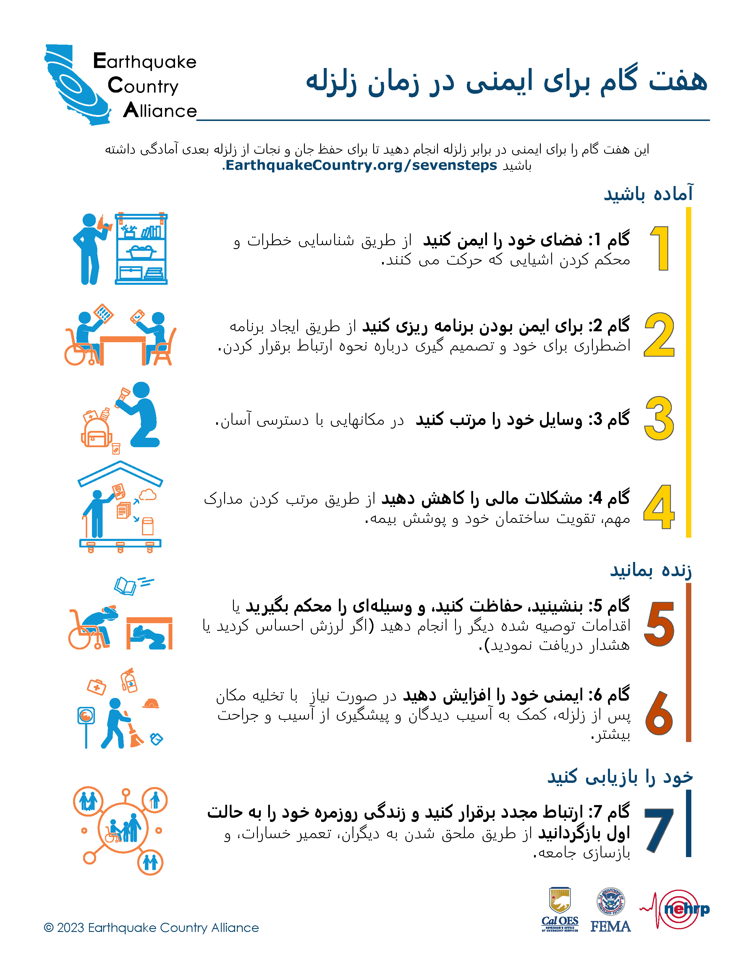 ECA منابع اطلاع رسانی ایمنی در زمان زلزله به زبان فارسی دارد که در پایین آمده و از اینجا قابل دانلود است EarthquakeCountry.org/farsi. هر مطلب برای استفاده توسط ابزارهای کمکی مانند برنامه های خواندن صفحه نمایش بهینه شده است.