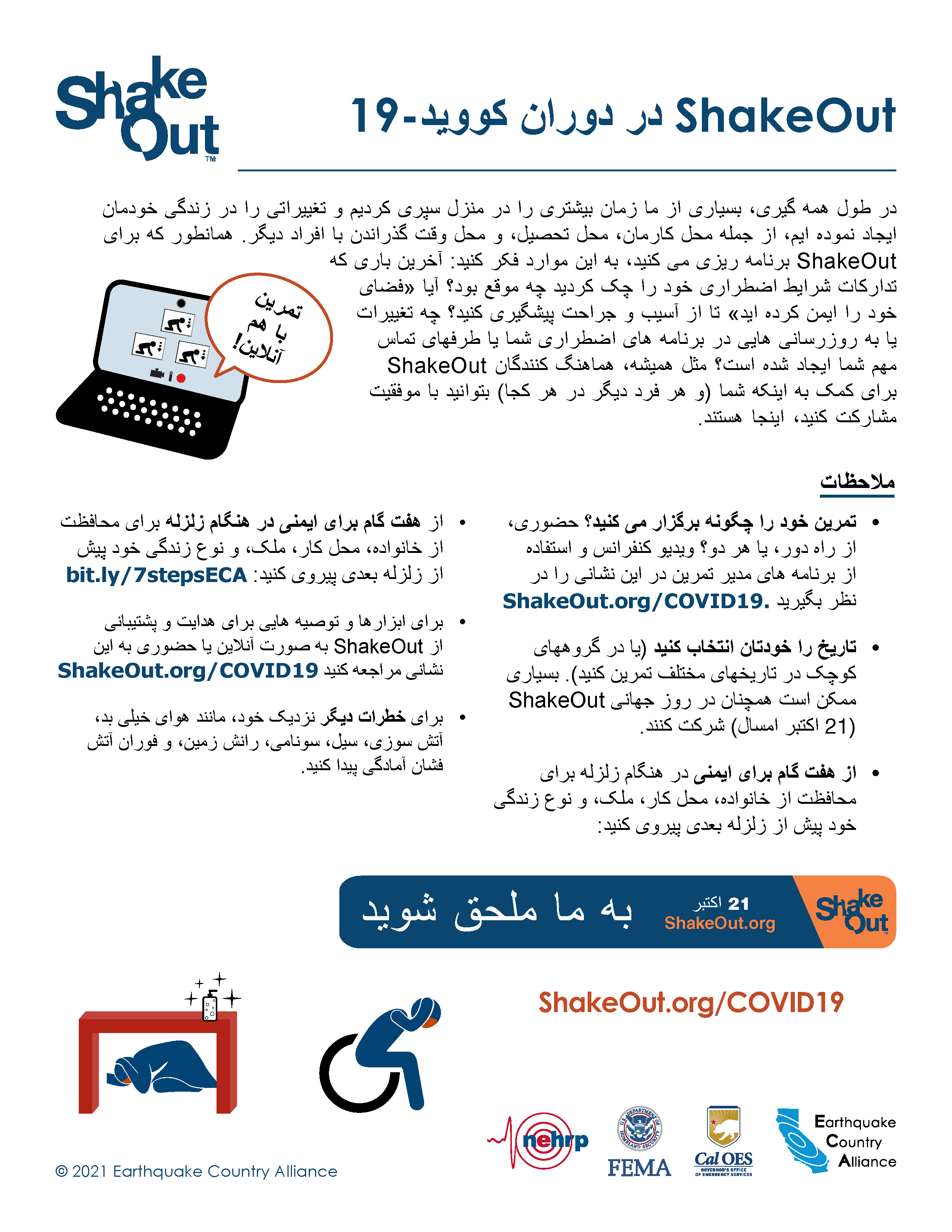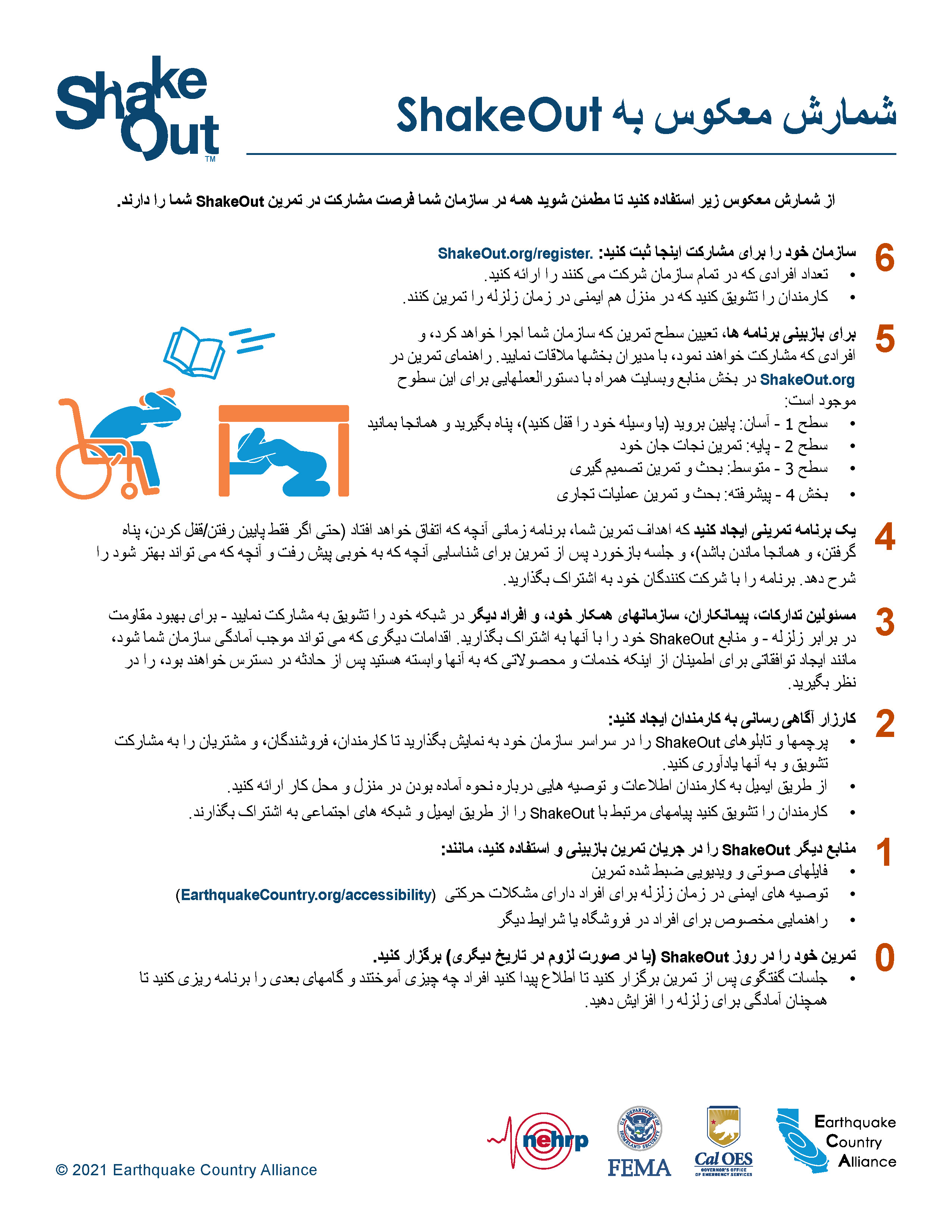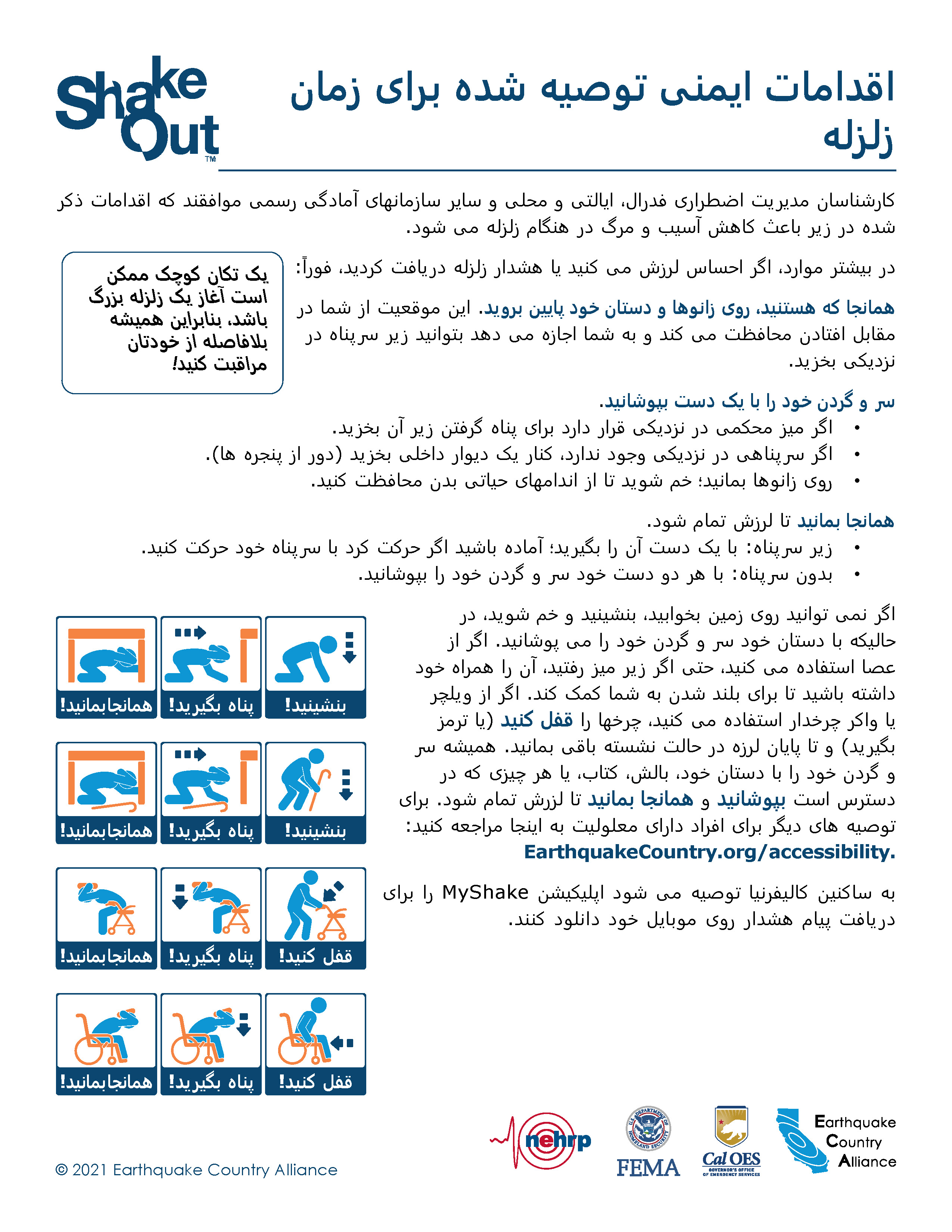 ECA has earthquake safety resources available in Farsi, listed below. Each document is configured with alt-text and correct read order (for people who use screen reader tools).