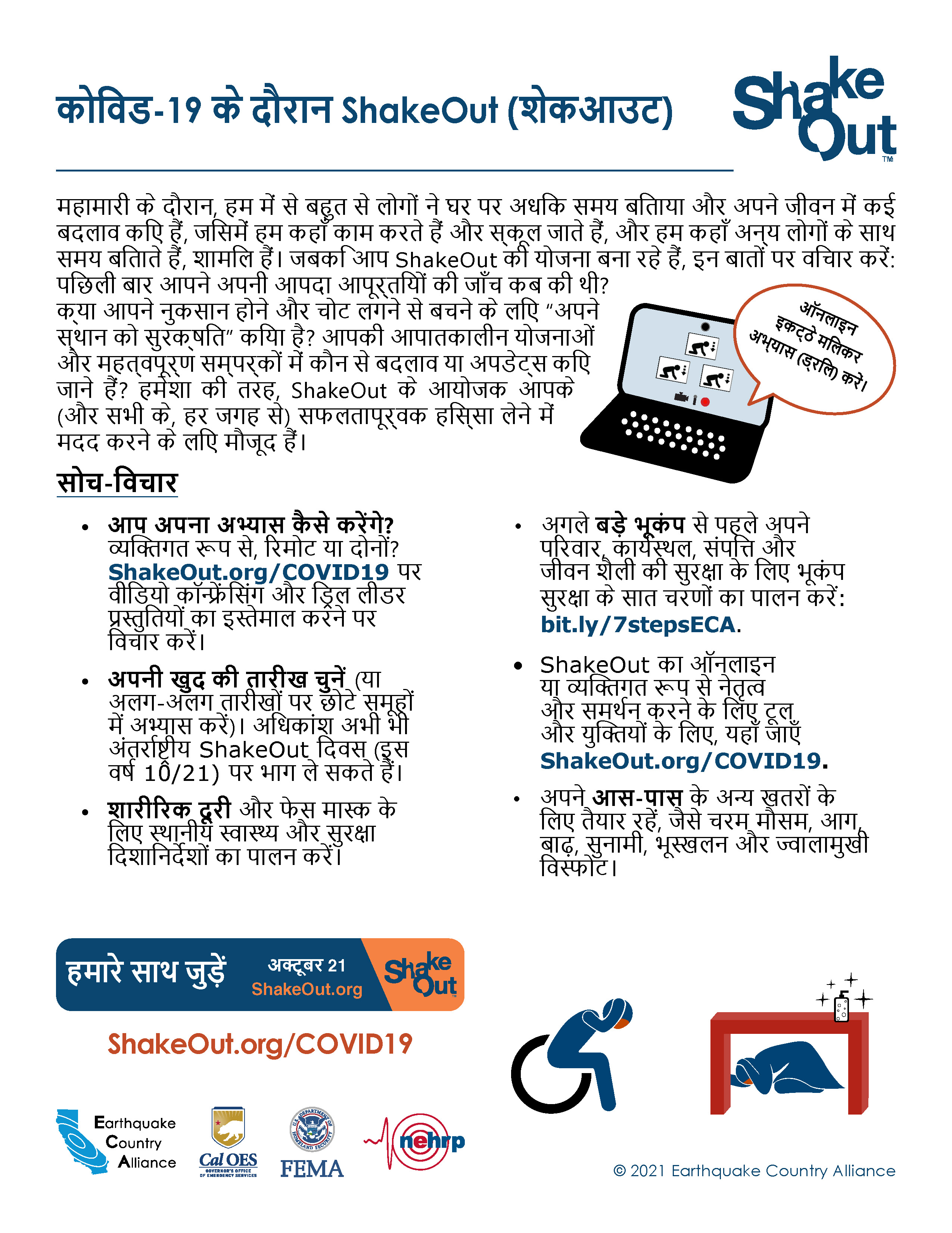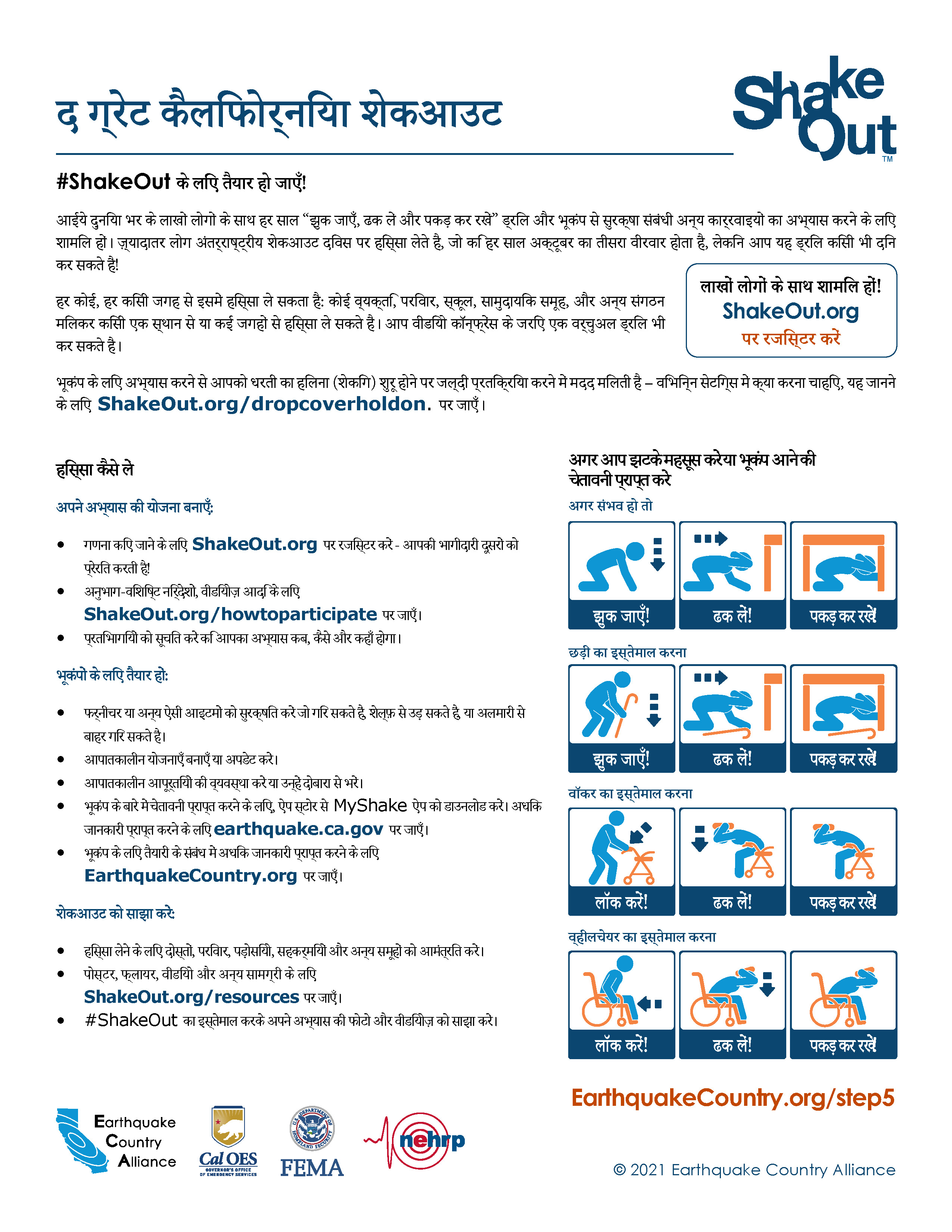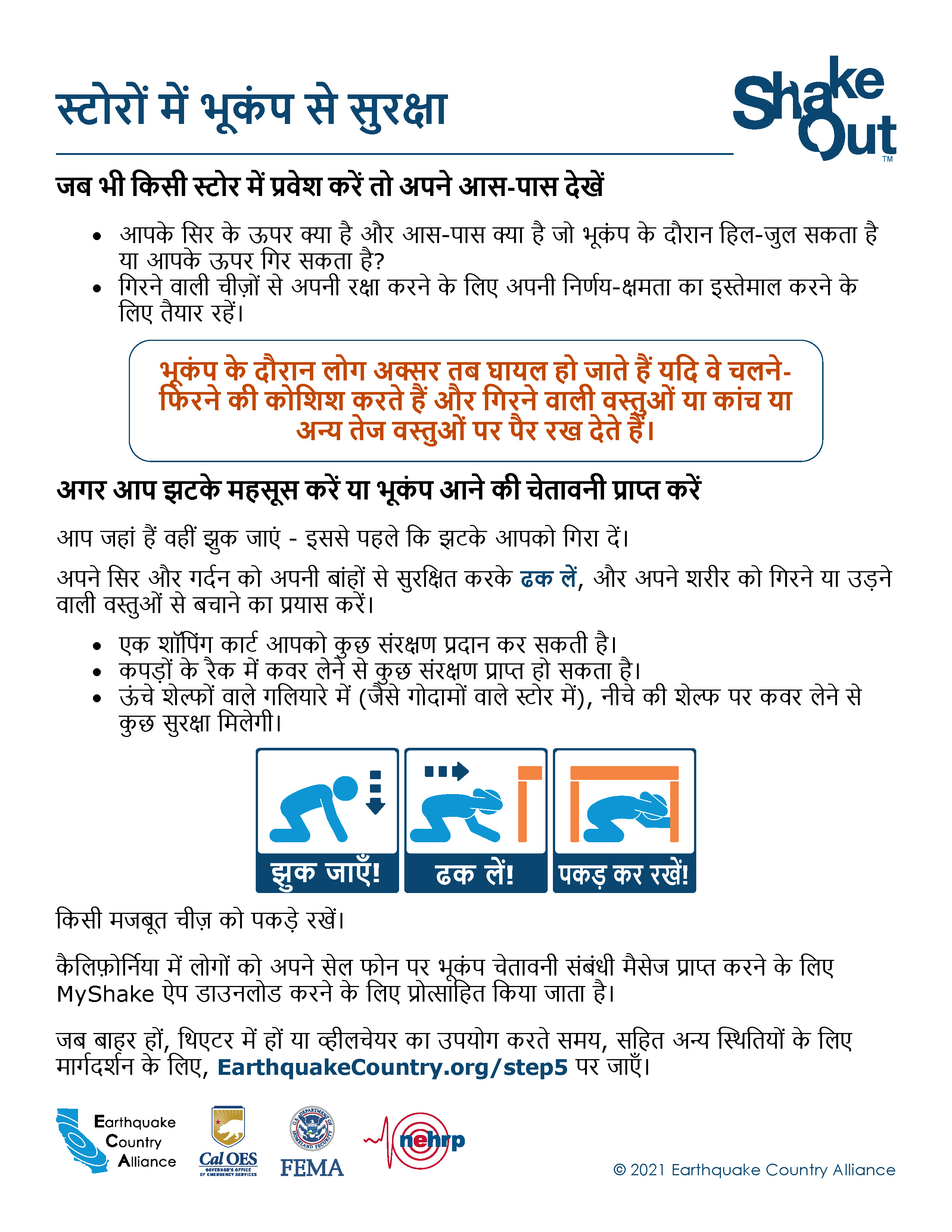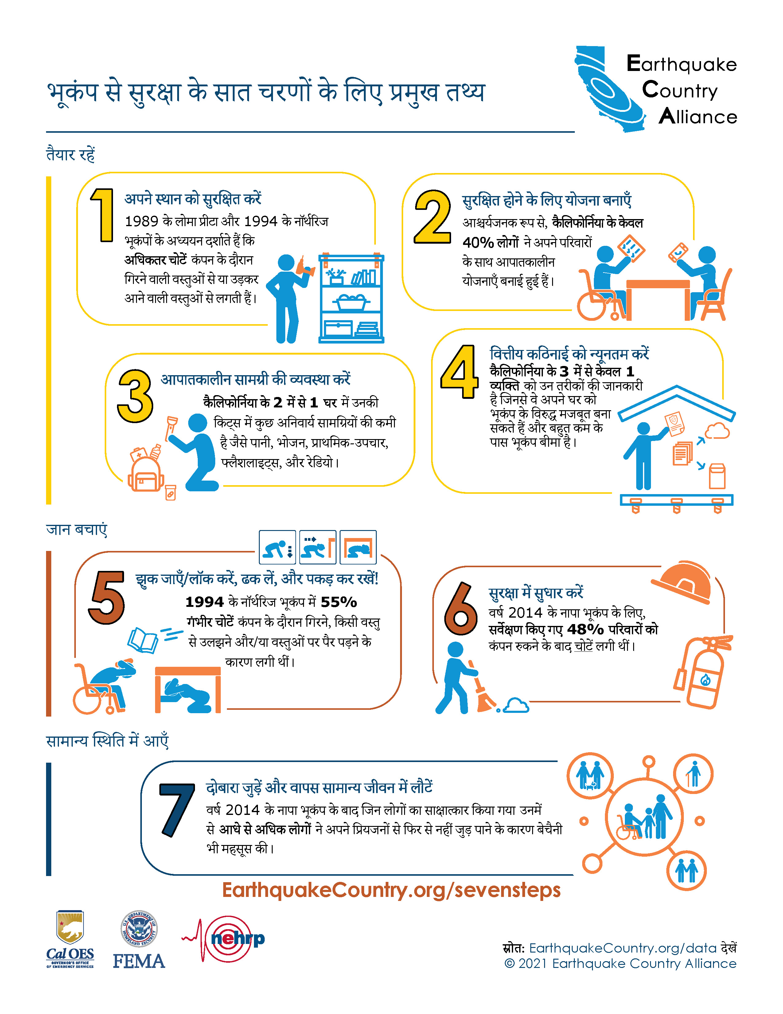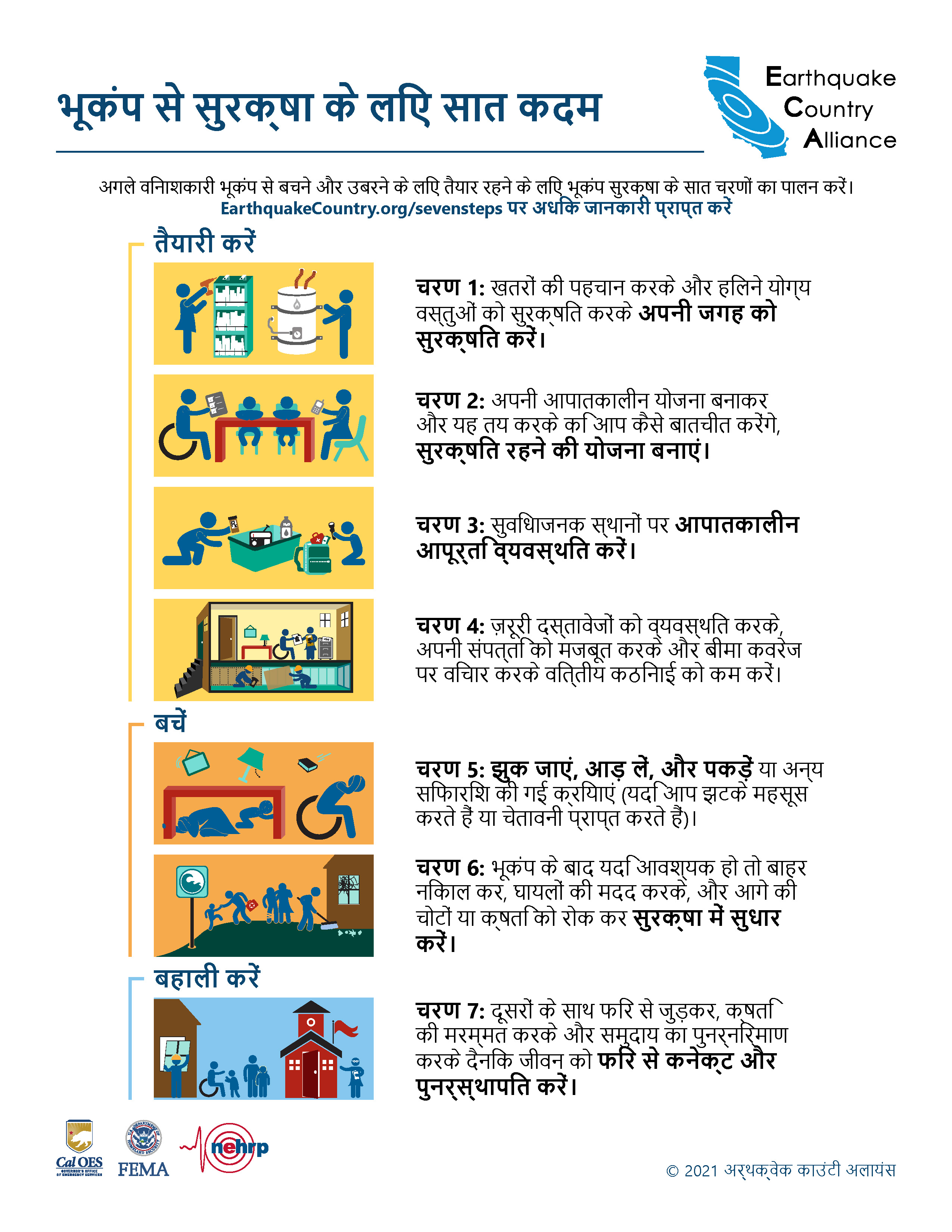 ECA के पास हिंदी में भूकंप सुरक्षा सूचनात्मक संसाधन मौजूद हैं, जो नीचे सूचीबद्ध हैं और EarthquakeCountry.org/hindi से डाउनलोड किए जा सकते हैं।