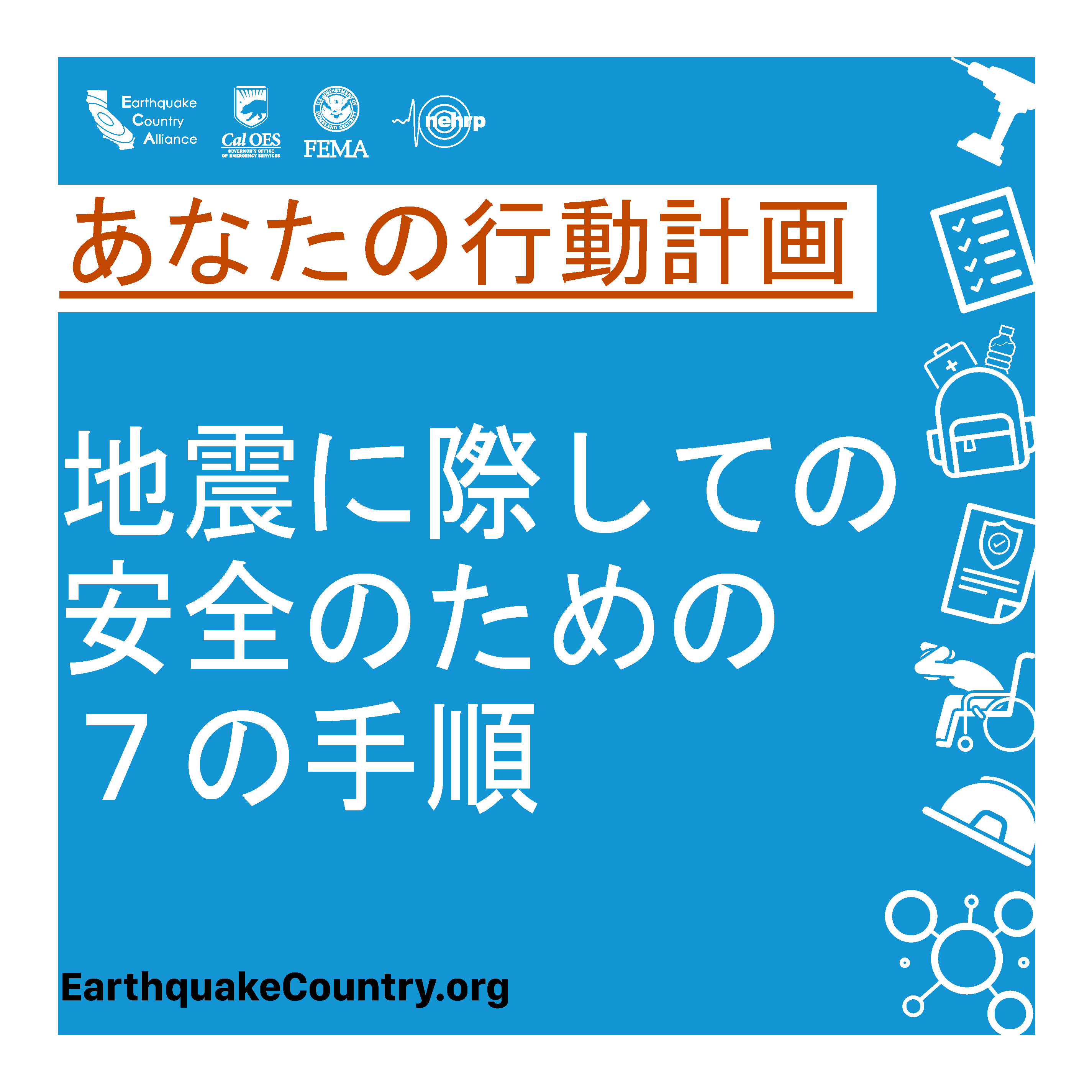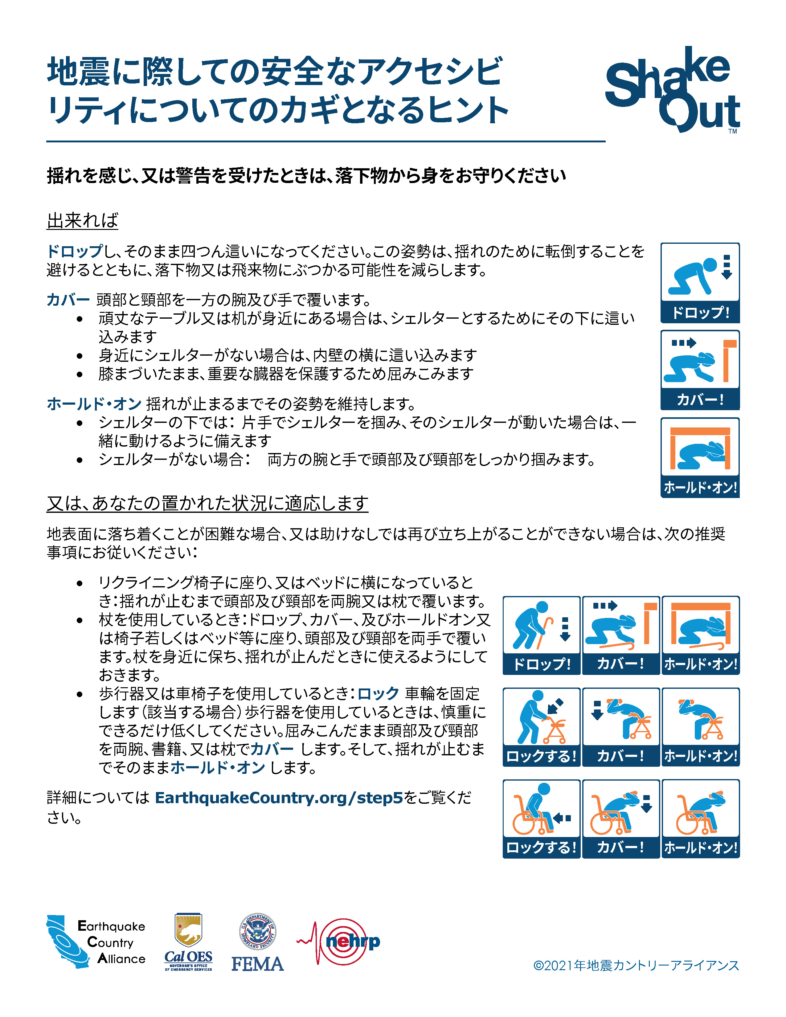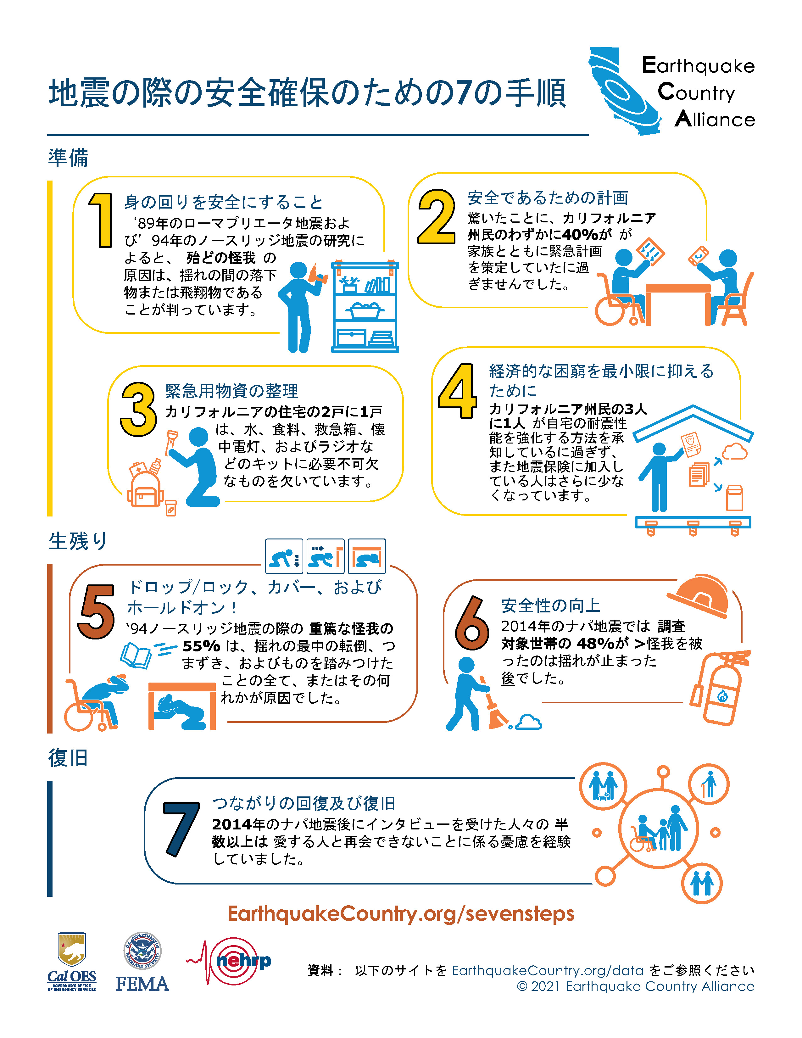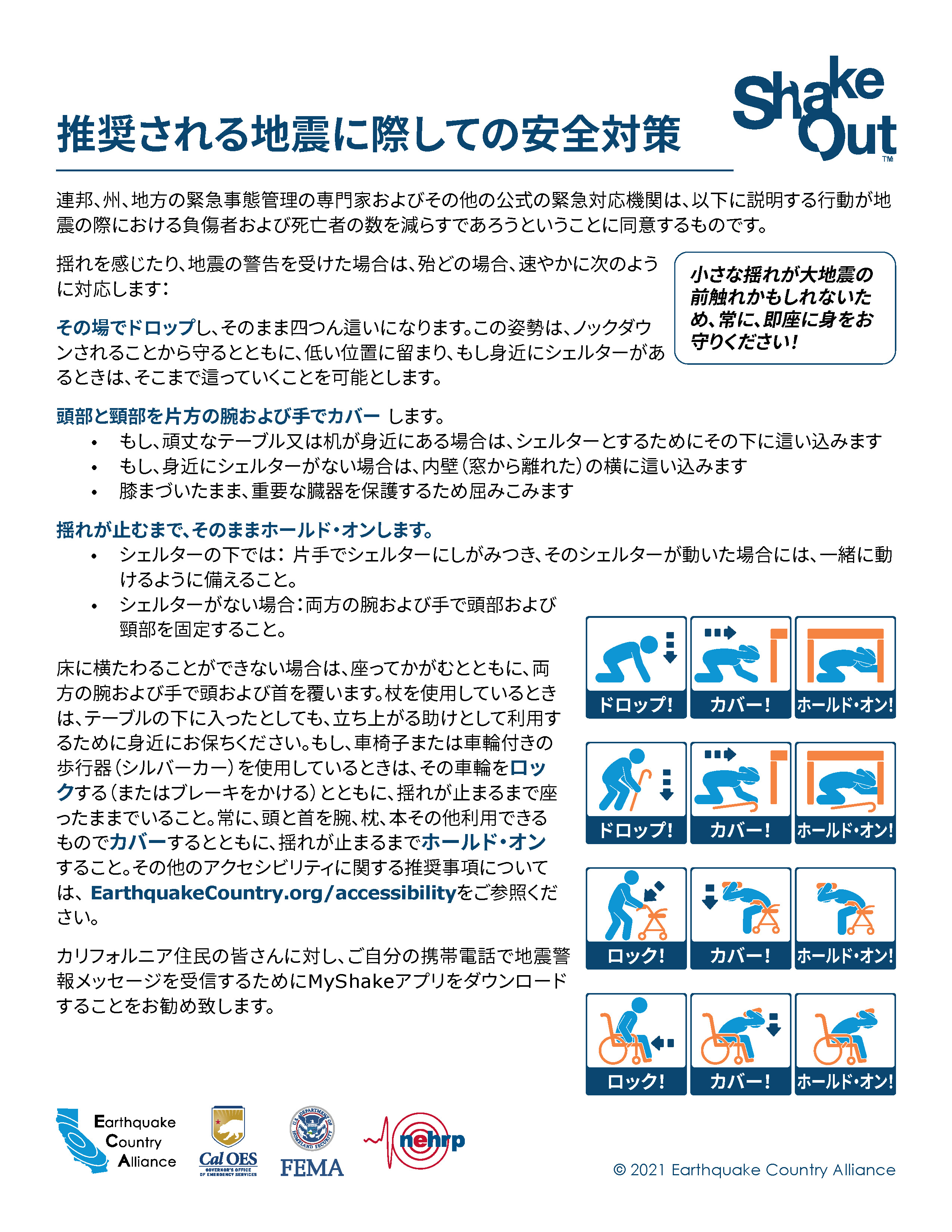 ECAには、日本語で記述された地震の際の安全に関する情報のリソースとして以下に示すものがあり、 EarthquakeCountry.org/japanese.からダウンロードできます。各々の文書は、スクリーンリーダーなどのアクセシビリティツールで使用するために最適化されています。