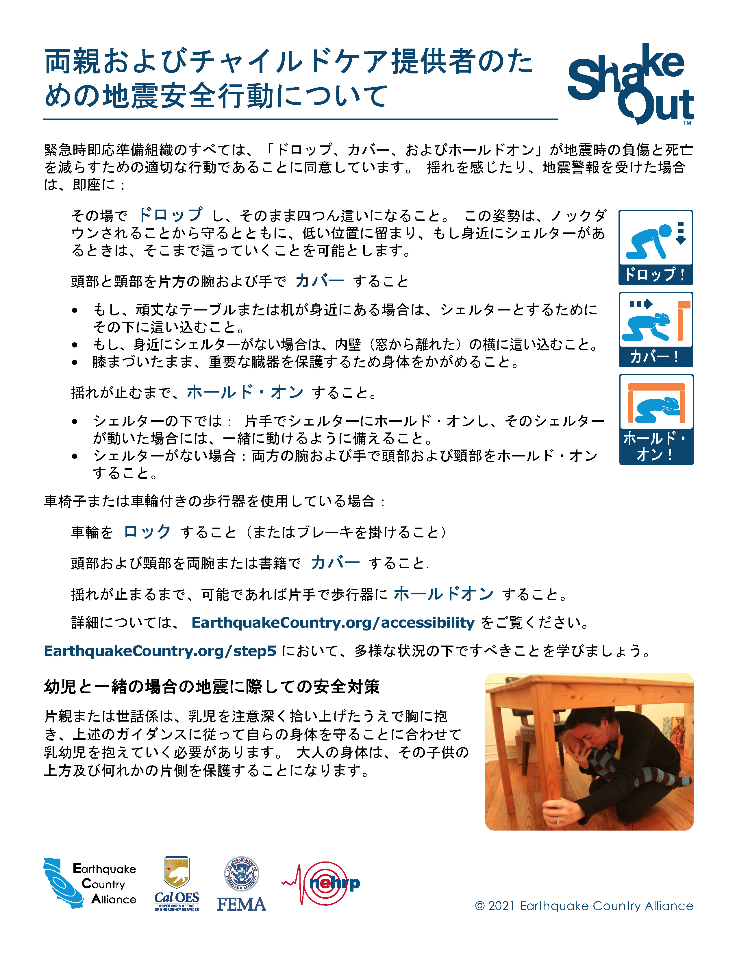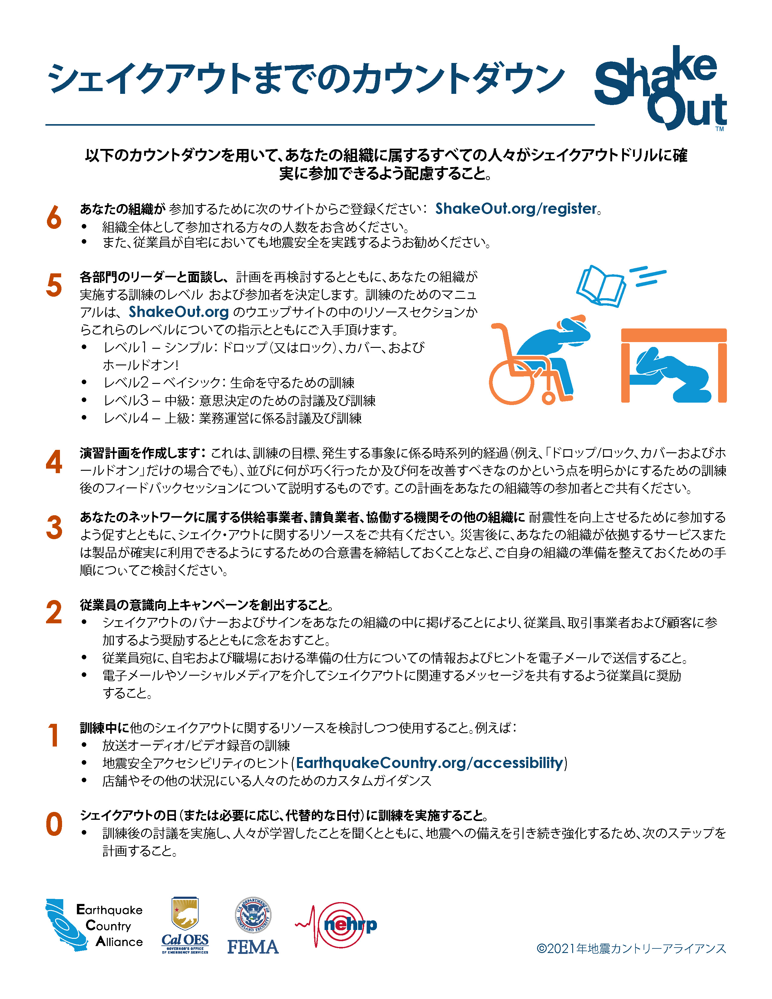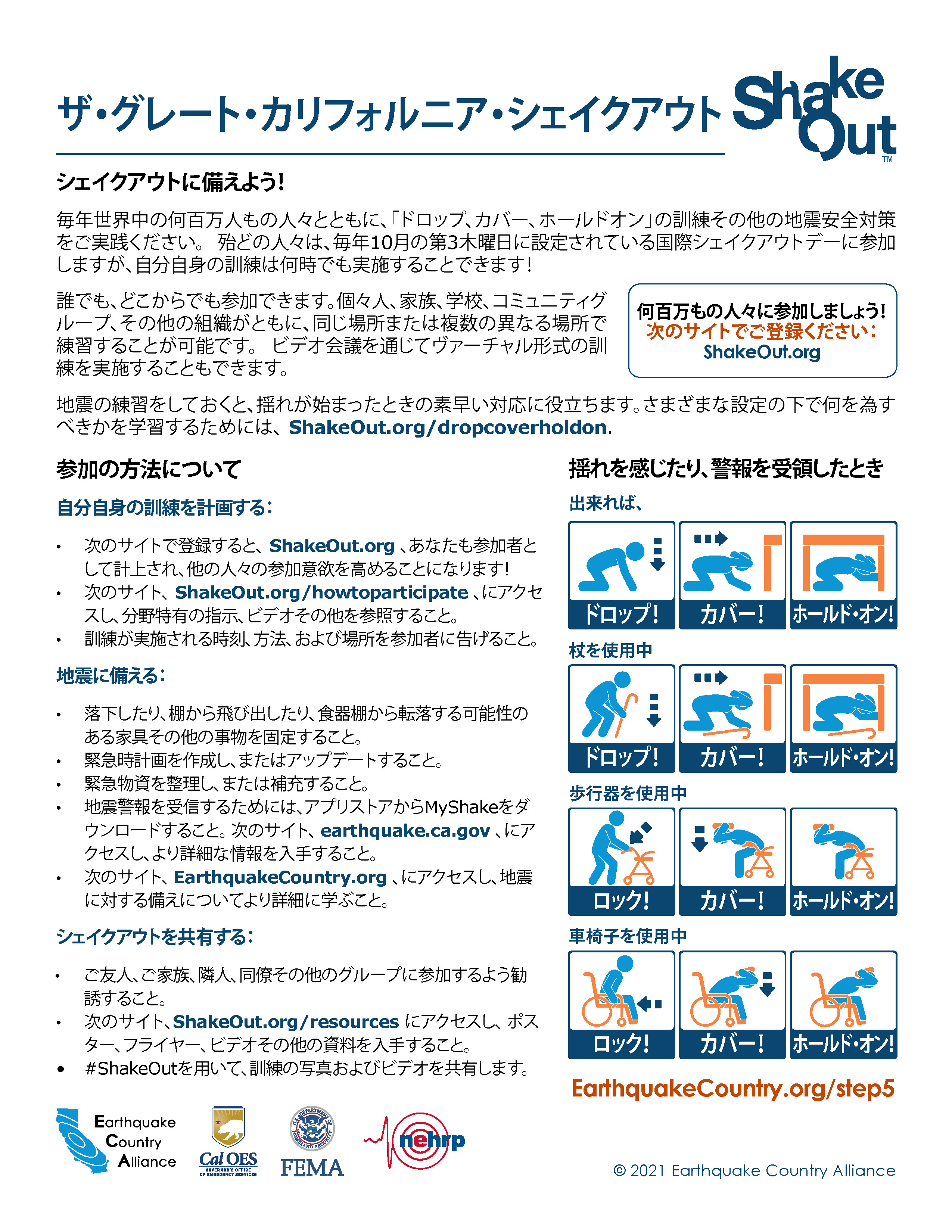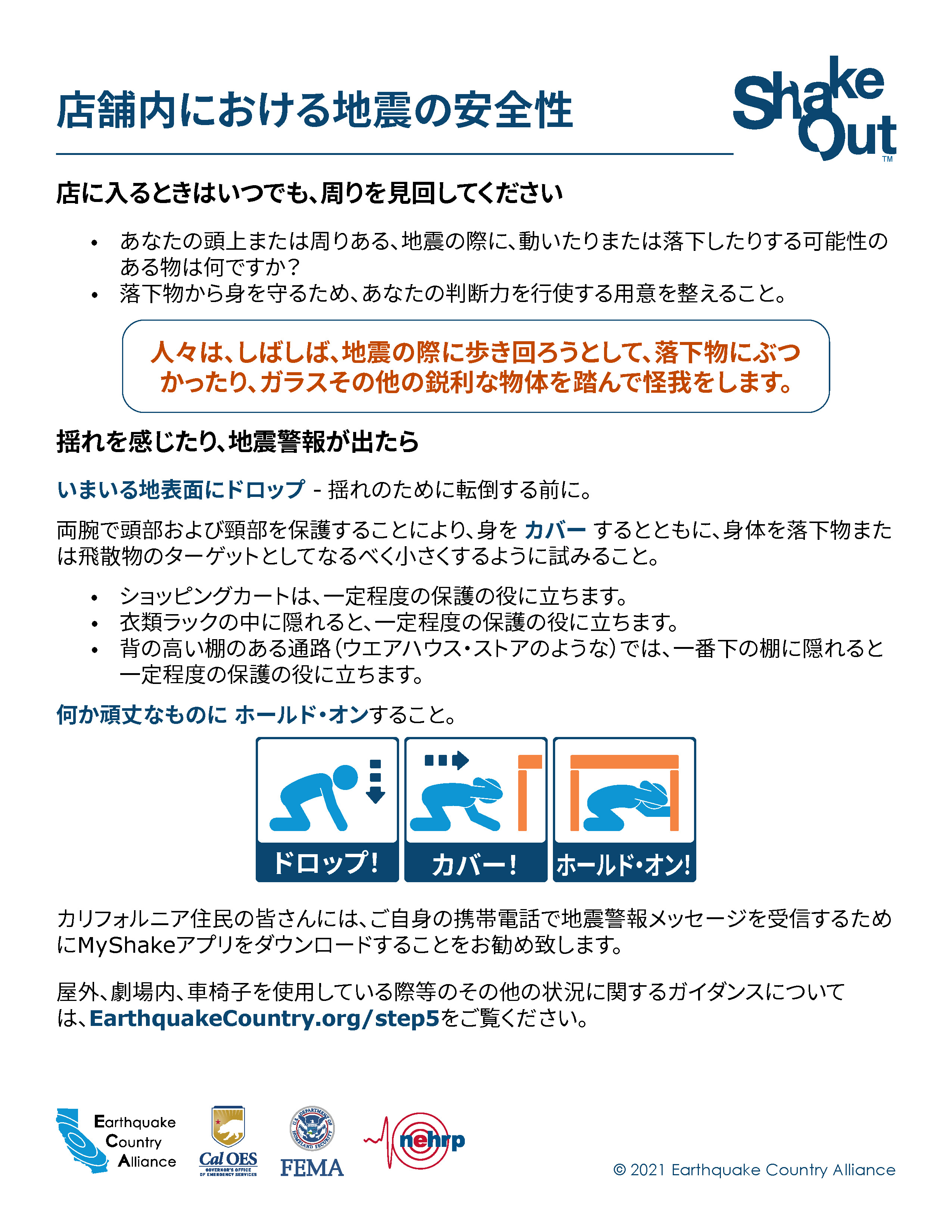 ECAには、日本語で記述された地震の際の安全に関する情報のリソースとして以下に示すものがあり、 EarthquakeCountry.org/japanese.からダウンロードできます。各々の文書は、スクリーンリーダーなどのアクセシビリティツールで使用するために最適化されています。