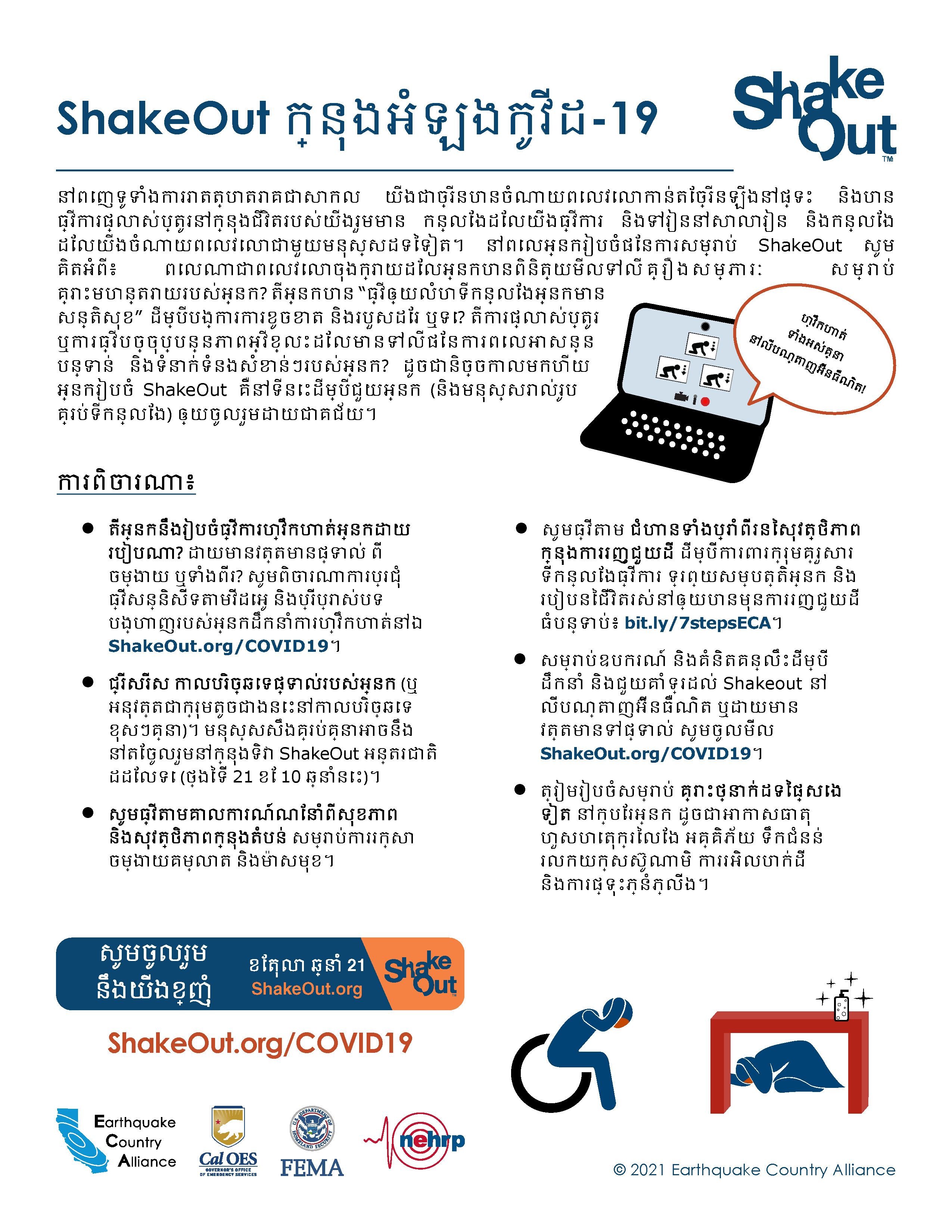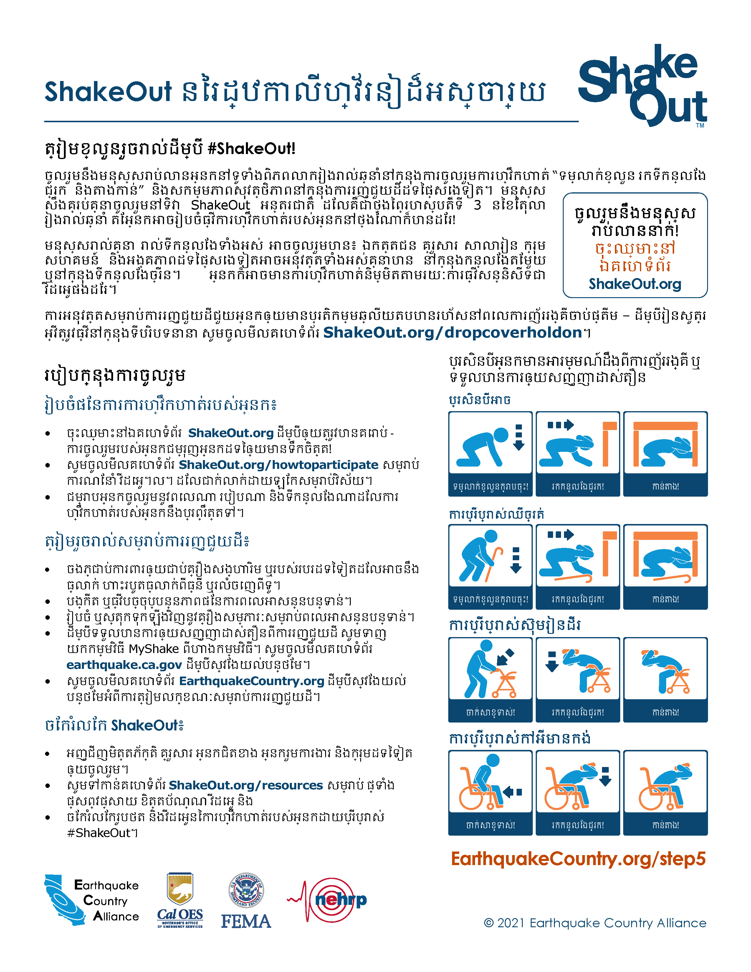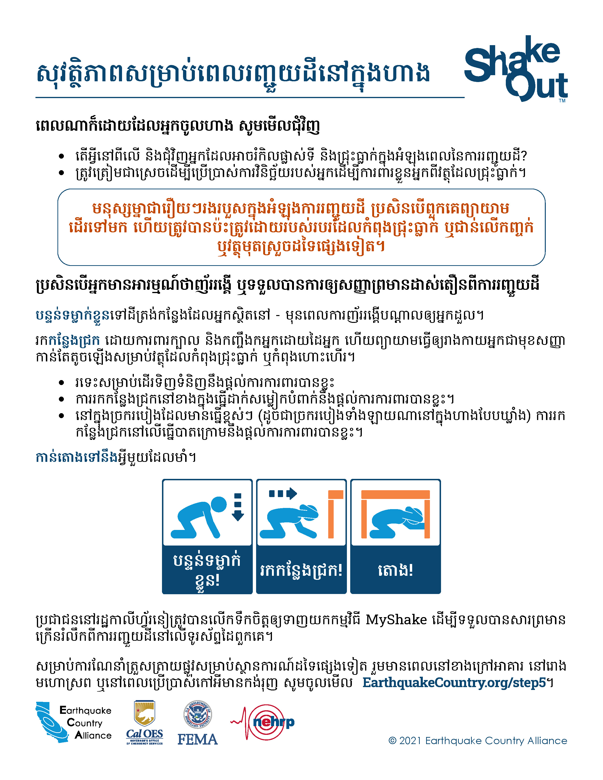 ECA មានធនធានព័ត៌មានស្តីពីសុវត្ថិភាពរញ្ជួយដីជាភាសាខ្មែរ ដែលរាយនាមខាងក្រោម និងអាចទាញដោនឡូដយកបាន ពីគេហទំព័រ EarthquakeCountry.org/khmer