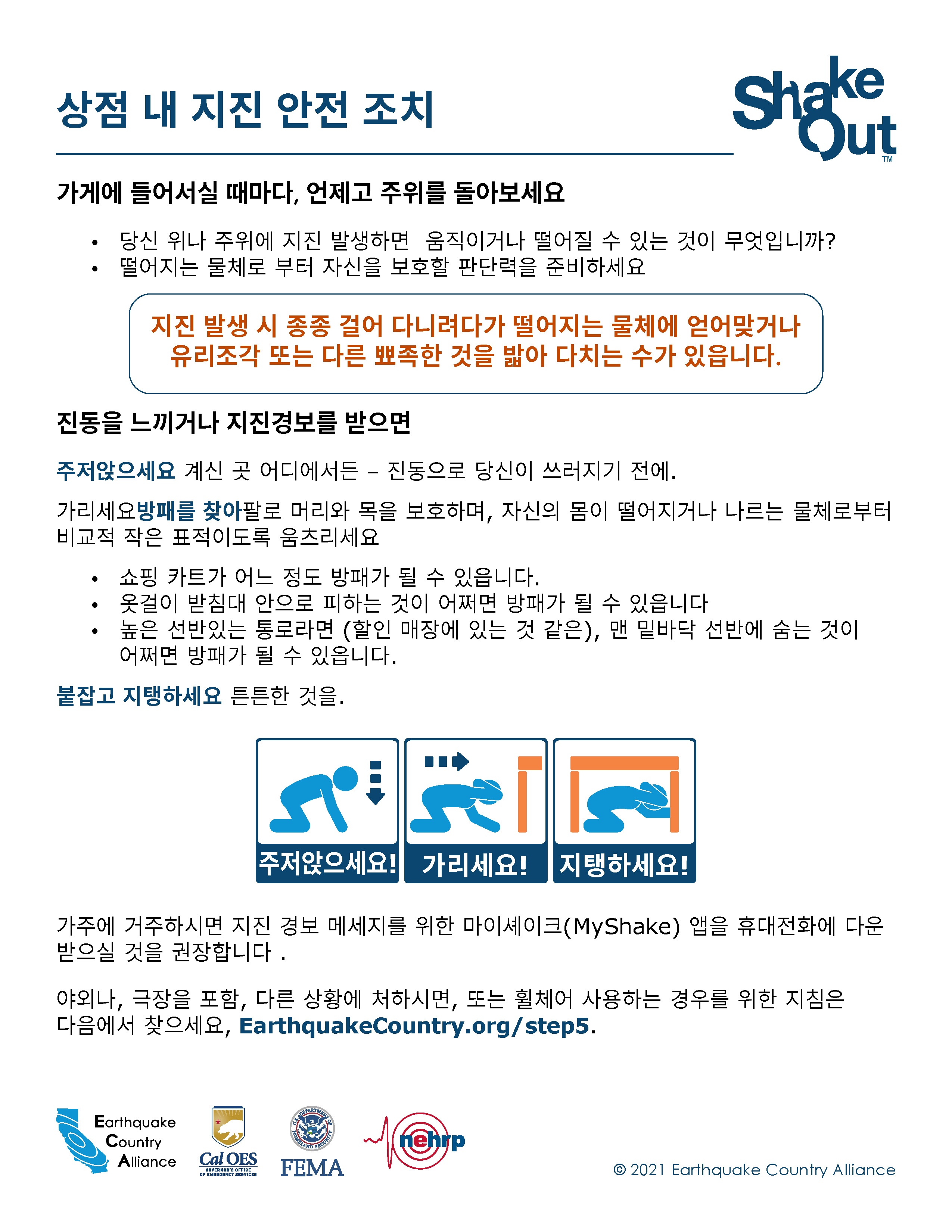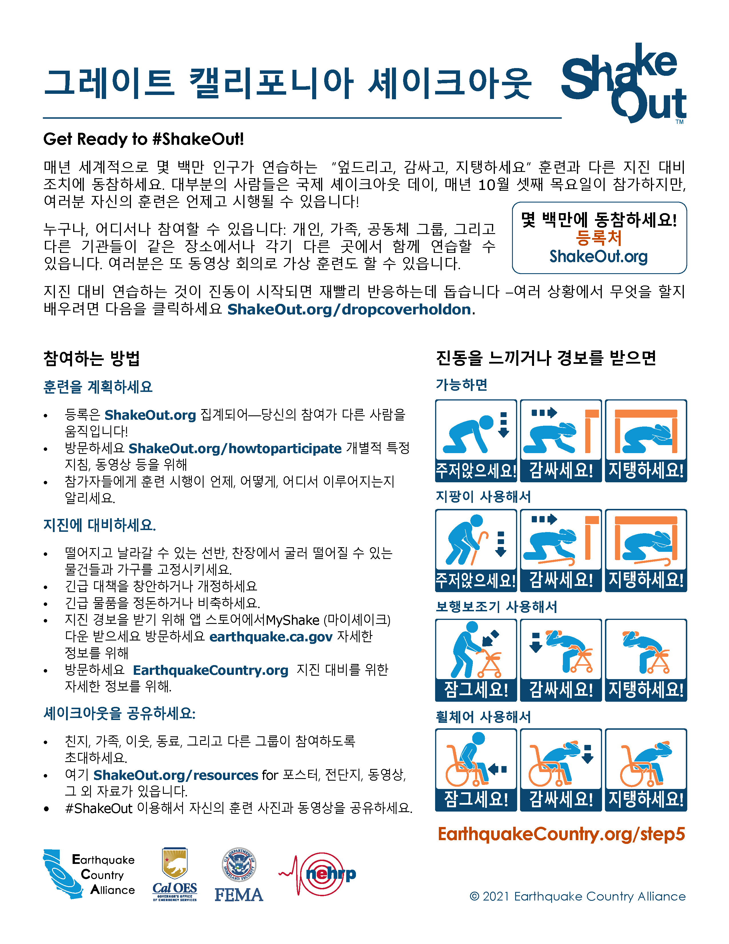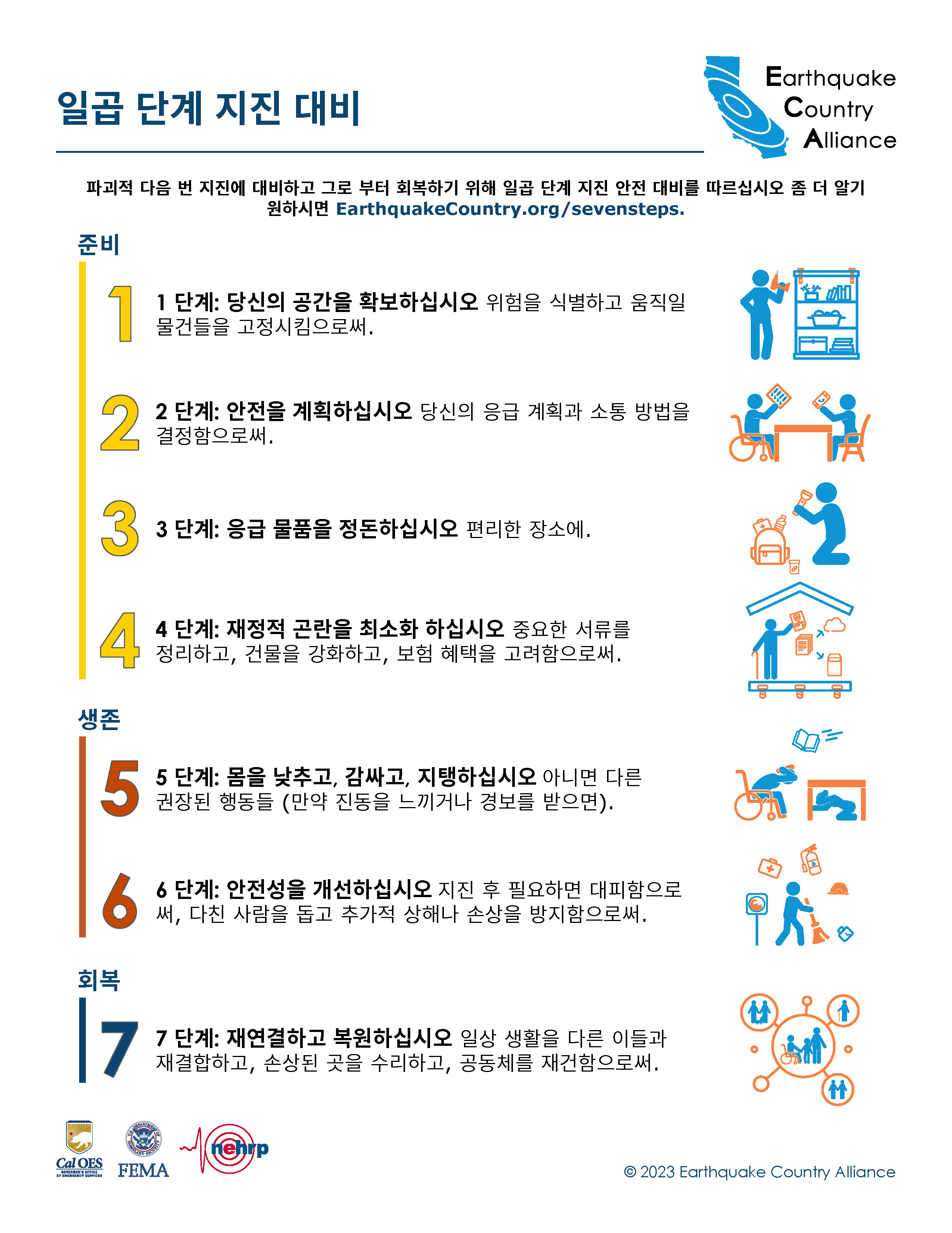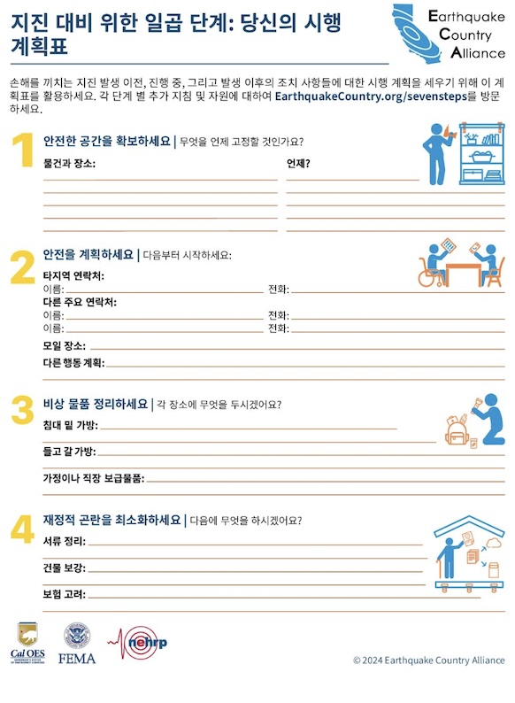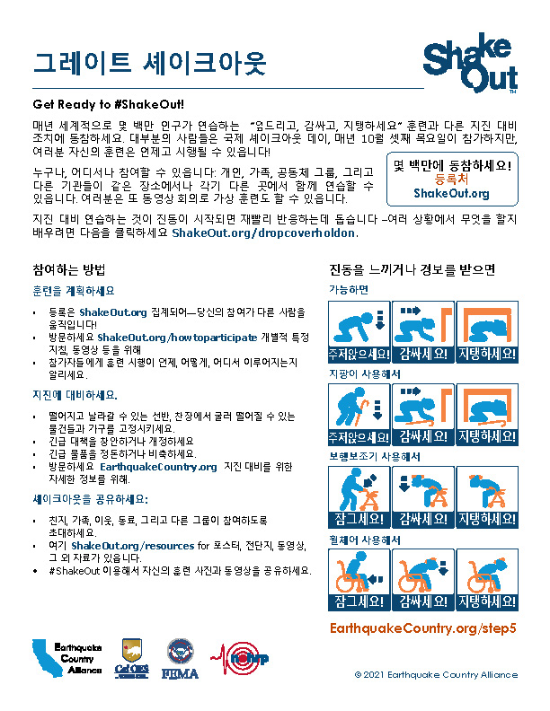 ECA는 한국어로 나온 지진 안전 정보자료가 아래 나와있고EarthquakeCountry.org/korean다운로드하십시오. 모든 문서는 스크린 리더 등 사용도구로 사용이 최적화되었습니다.