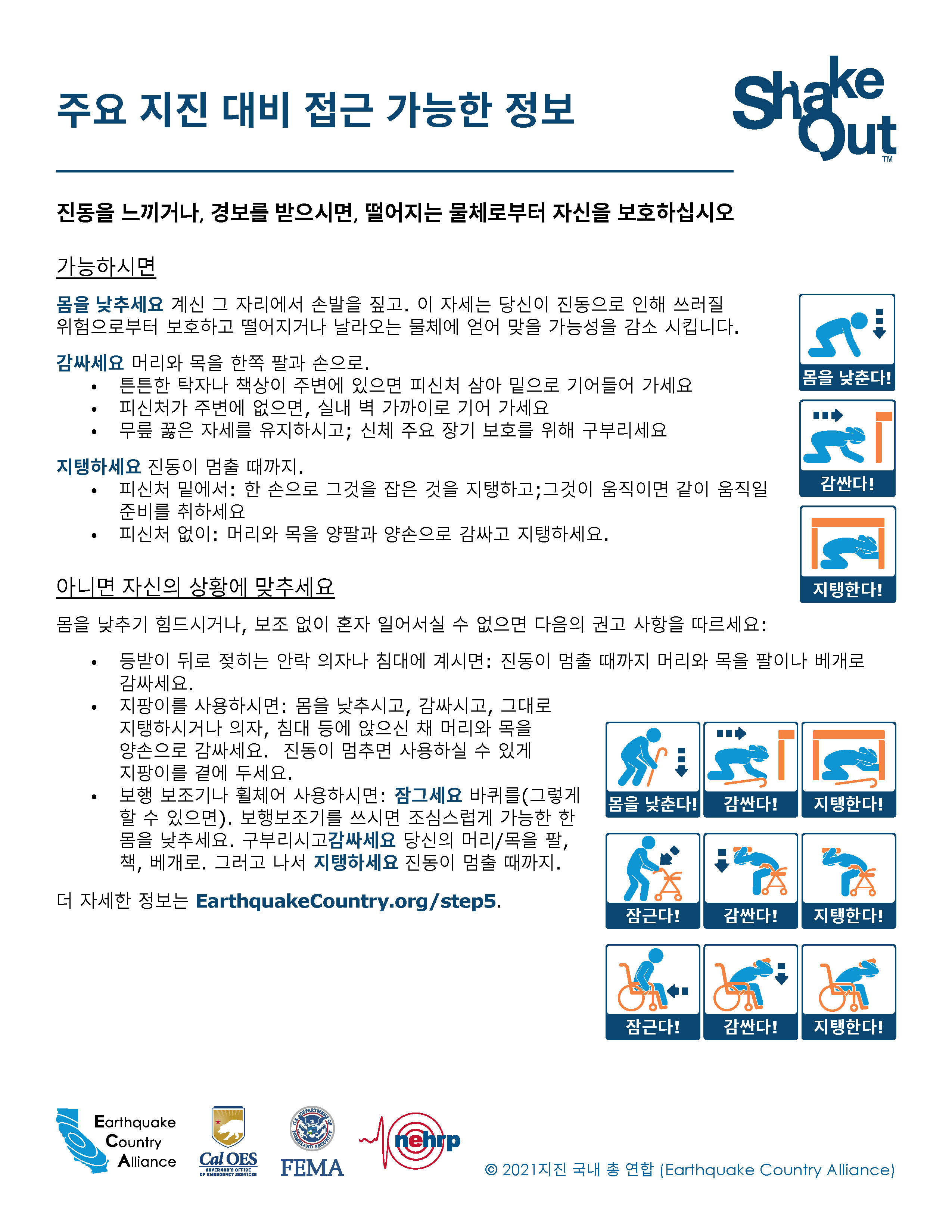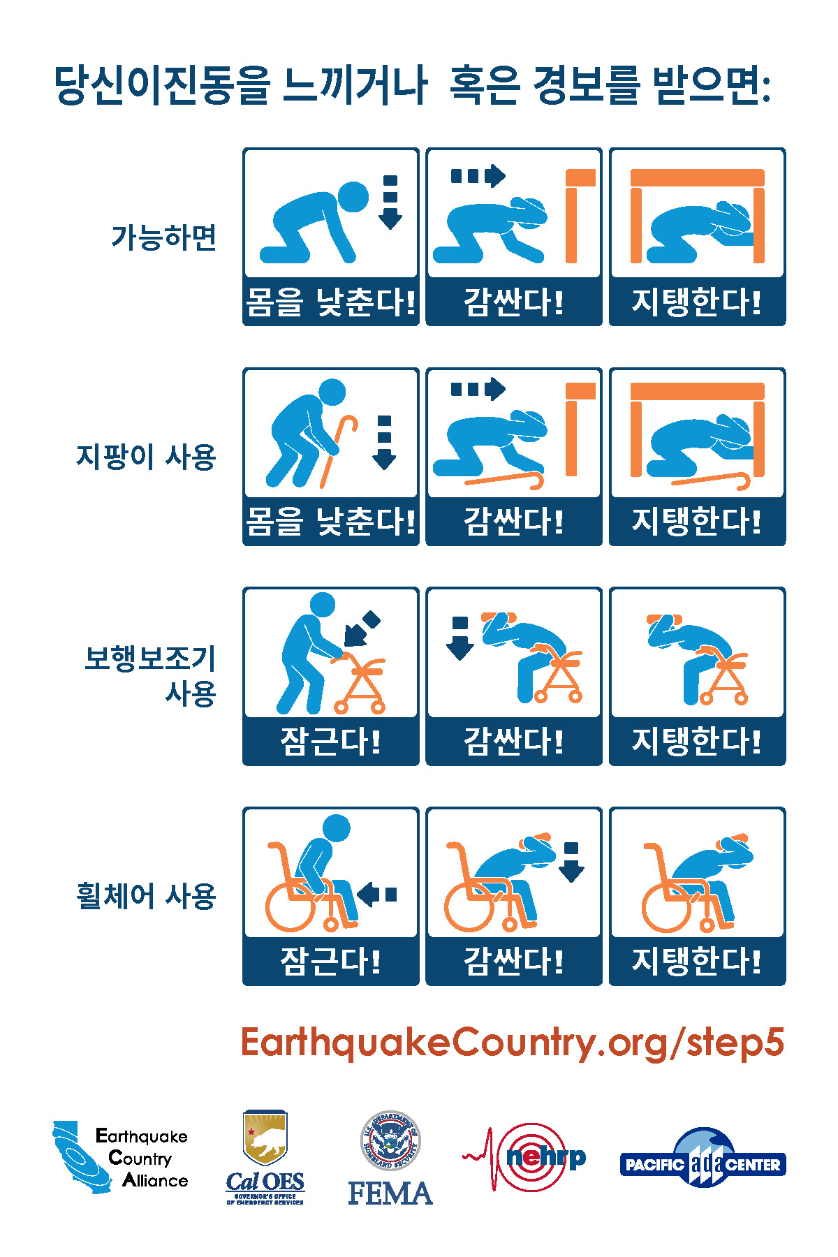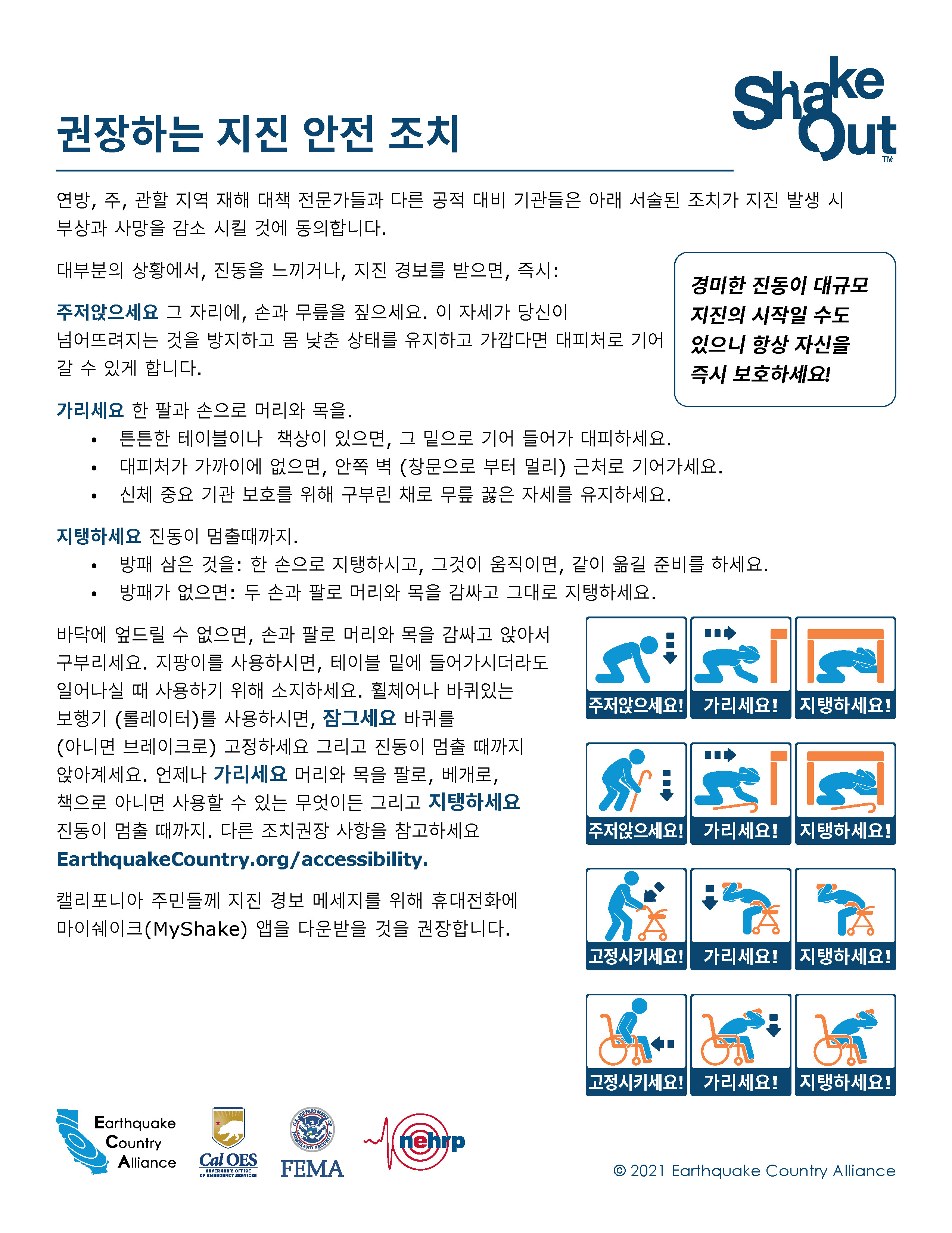 ECA는 한국어로 나온 지진 안전 정보자료가 아래 나와있고EarthquakeCountry.org/korean다운로드하십시오. 모든 문서는 스크린 리더 등 사용도구로 사용이 최적화되었습니다.
