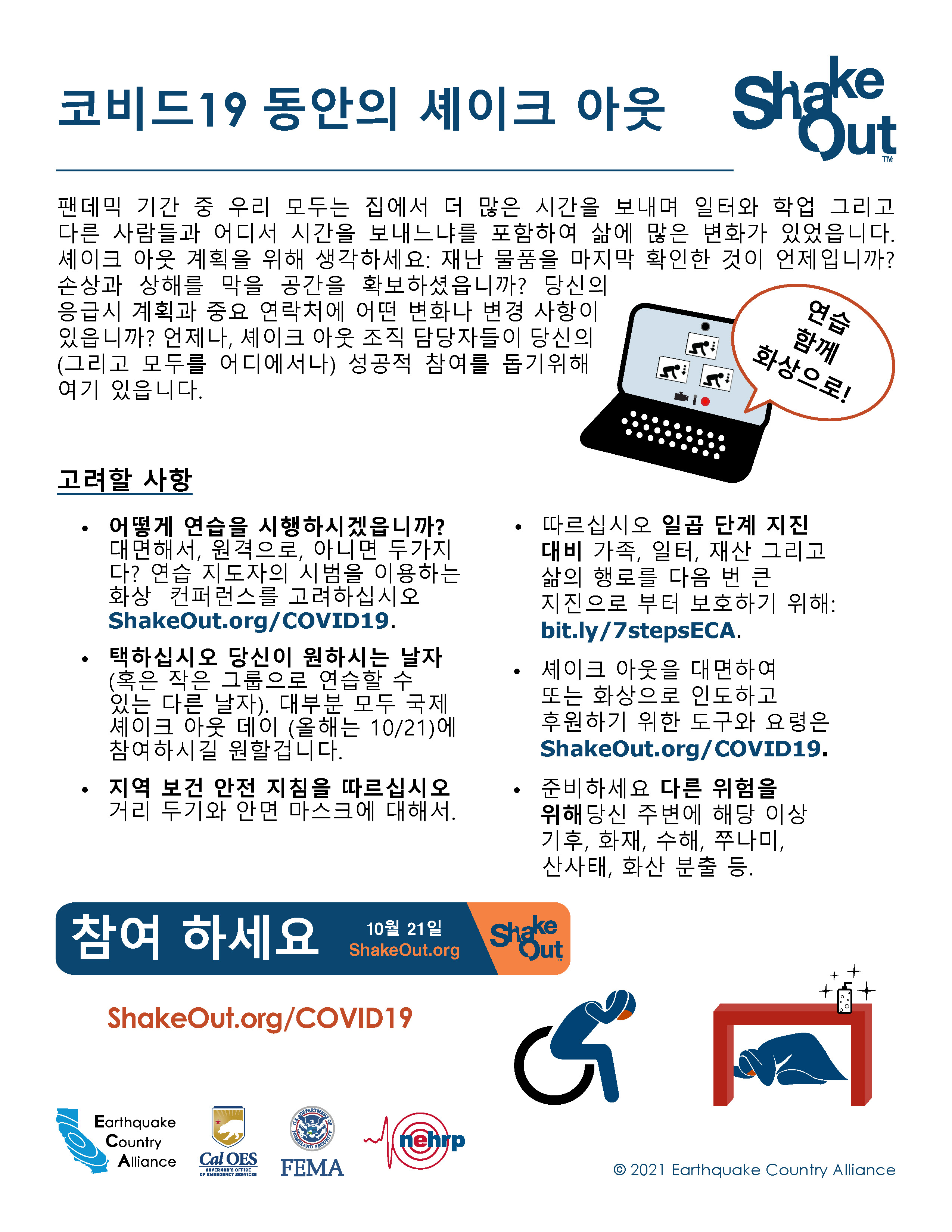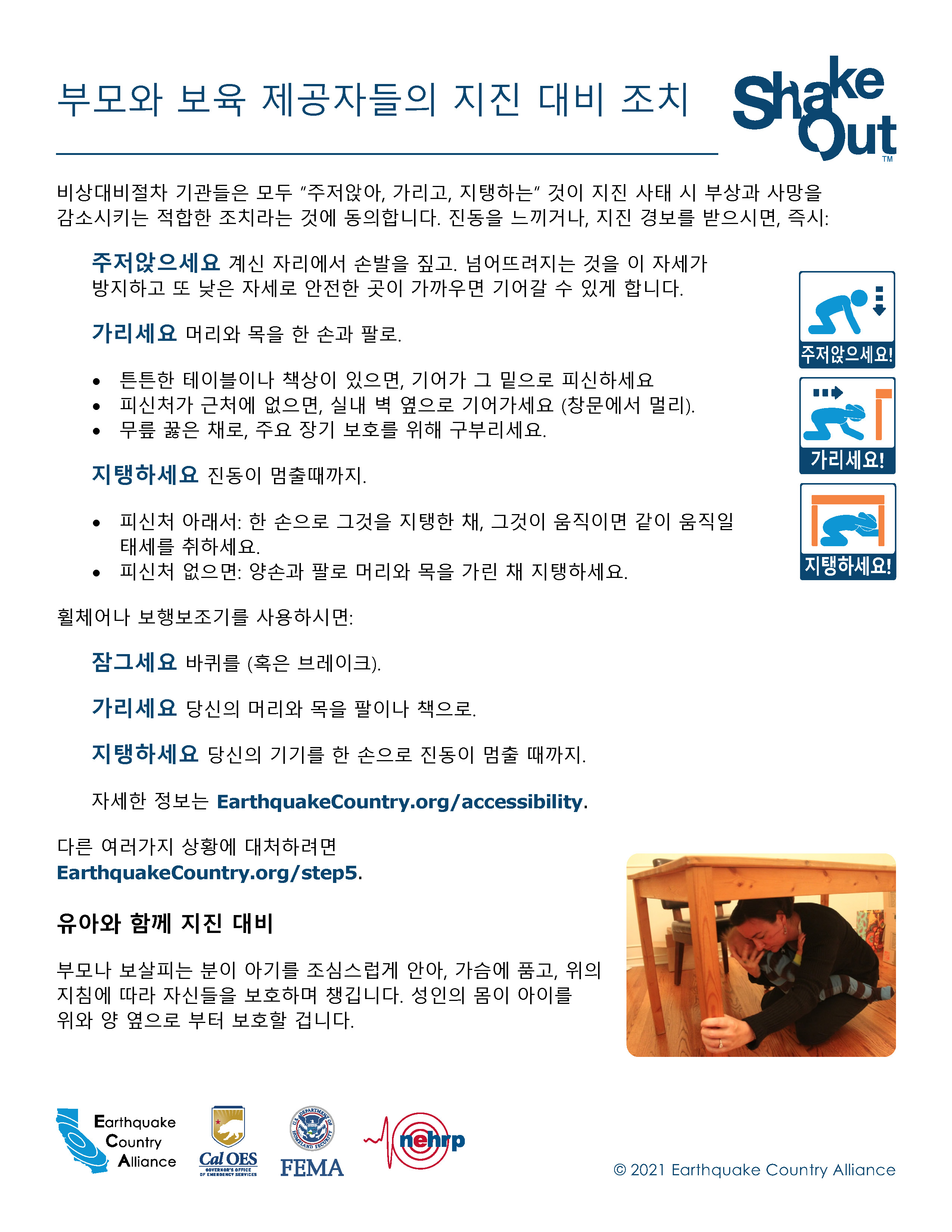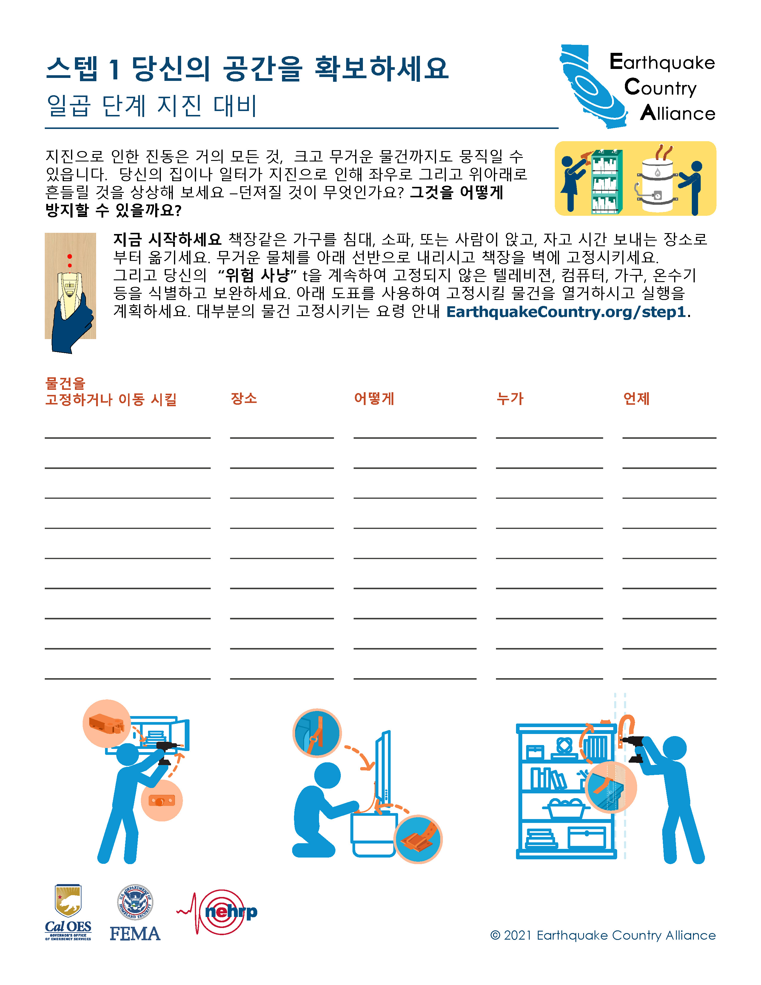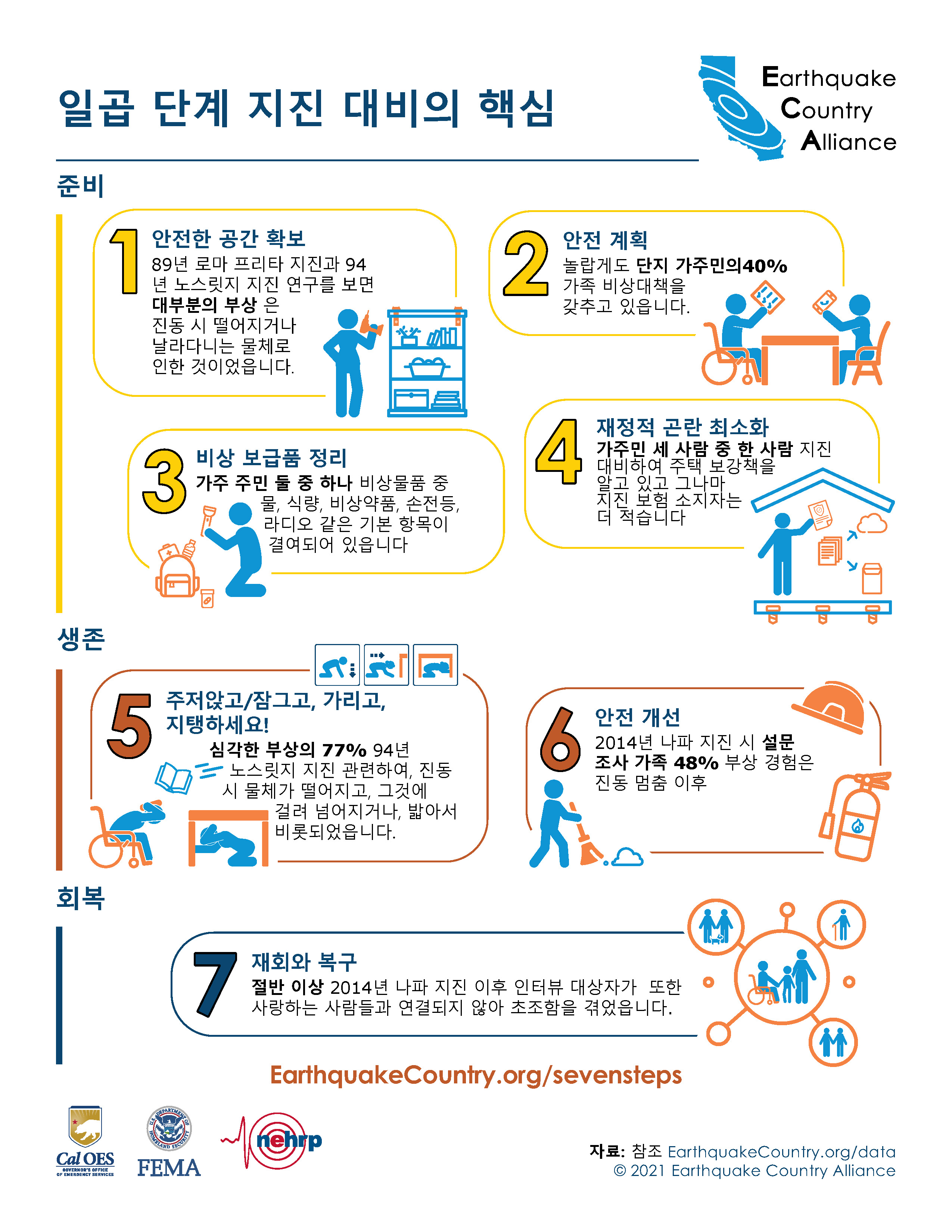 ECA는 한국어로 나온 지진 안전 정보자료가 아래 나와있고EarthquakeCountry.org/korean다운로드하십시오. 모든 문서는 스크린 리더 등 사용도구로 사용이 최적화되었습니다.
