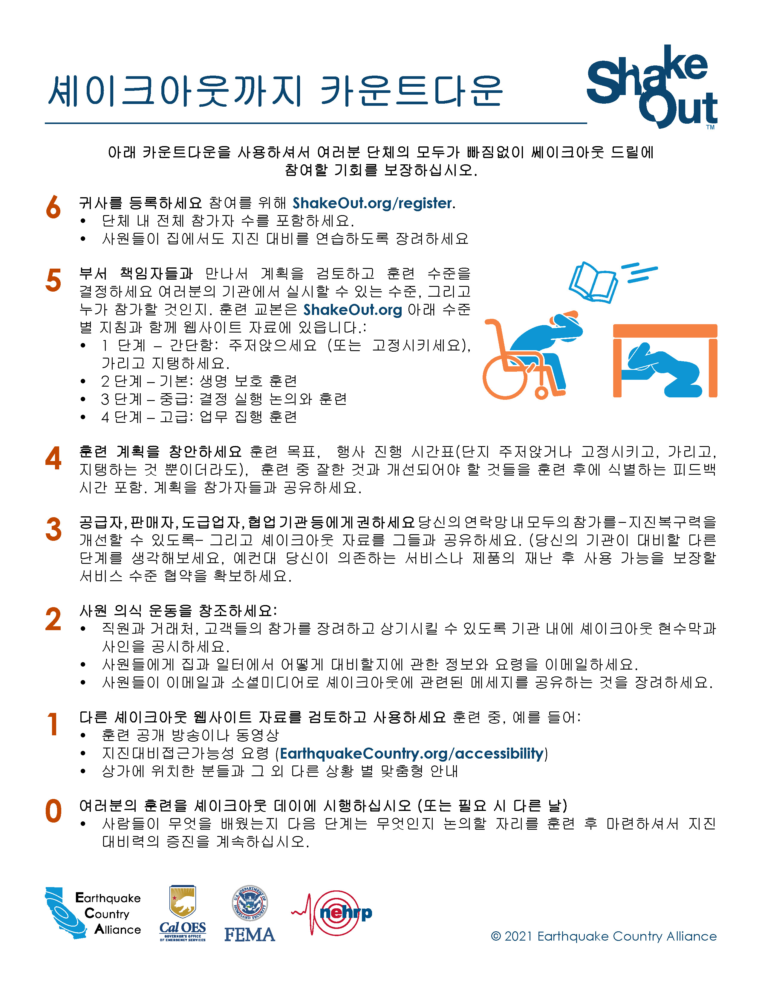 ECA has earthquake safety resources available in Korean, listed below. Each document is configured with alt-text and correct read order (for people who use screen reader tools).