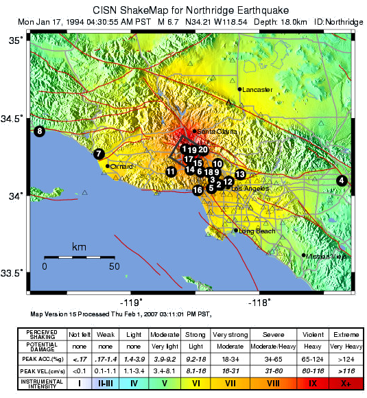 energy released in the shaking, 6.7 for the Northridge earthquake), however this does not provide any details for how the intensity of shaking is stronger in some places than others. This is the purpose of a ShakeMap, which quickly plots data from seismometers to show which areas shook more strongly than others. ShakeMaps today are created within a few minutes using digital data. A similar map in 1994 took more than a month to create!
