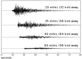 These seismograms show how the ground moved at four seismic stations during an earthquake. The time when the ground starts shaking is the arrival of the P-wave. The ground starts shaking sooner and shakes more at sites nearer the earthquake.
