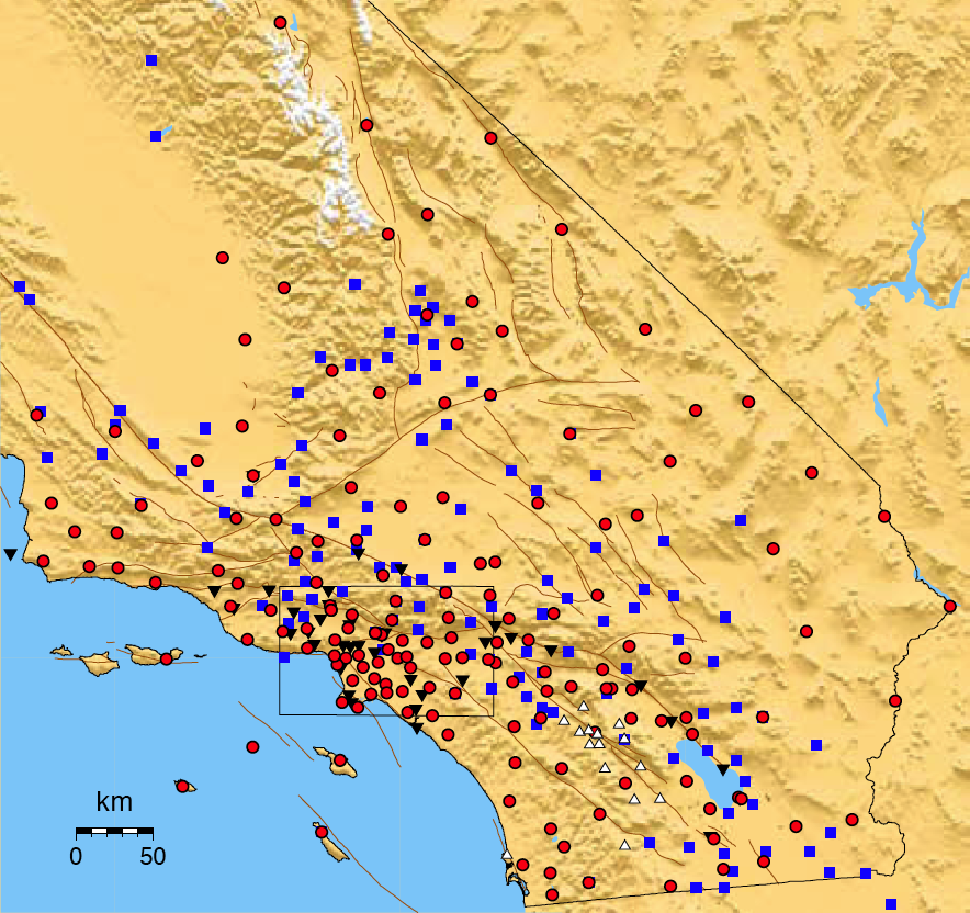 Larger imageThe Southern California Seismic Network (SCSN) records data from more than 370 seismic stations. Each station records seismic waves from both near and distant earthquakes. All the data are transmitted automatically to Caltech/USGS in Pasadena for processing and distribution of information such as epicenters, magnitudes, and ShakeMaps. The SCSN is also part of the California Integrated Seismic Network (CISN) that coordinates earthquake monitoring statewide. The symbols indicate different types of seismic stations.