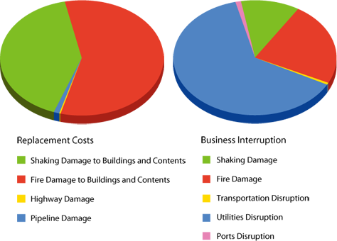 The ShakeOut earthquake will cause many shocks to southern California’s regional economy. Understanding and comparing the impact of these shocks is important to recovery planning. When considering the cost of replacing lost buildings, building contents, and infrastructure, fire creates the biggest shock to the economic system, bigger than shaking, fault rupture, landslides, and liquefaction combined. This makes sense, because fire can destroy so completely. However, when considering the length of time that normal business will be interrupted, disruption of utility service creates the biggest shock. This makes sense, because few businesses can function without water or power.
