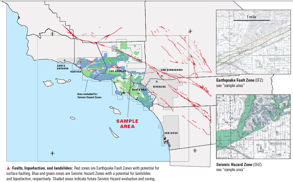 In addition to strong shaking during earthquakes and the potential for tsunamis along the coast, there are location-specific hazards that can cause additional damage: surface rupture, liquifaction, and landslides. The California Geological Survey produces maps that identify Earthquake Fault Zones and Seismic Hazard Zones where these hazards may occur. State laws require that every person starting to “put down roots” by buying a home or real property in California be told if the property is in one of these zones. You can also visit myhazards.caloes.ca.gov/ which has an interactive map for learning about the hazards where you live or work.