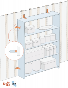 To secure shelf units that may cause injury or damage from falling over and will dump contents onto the floor.
